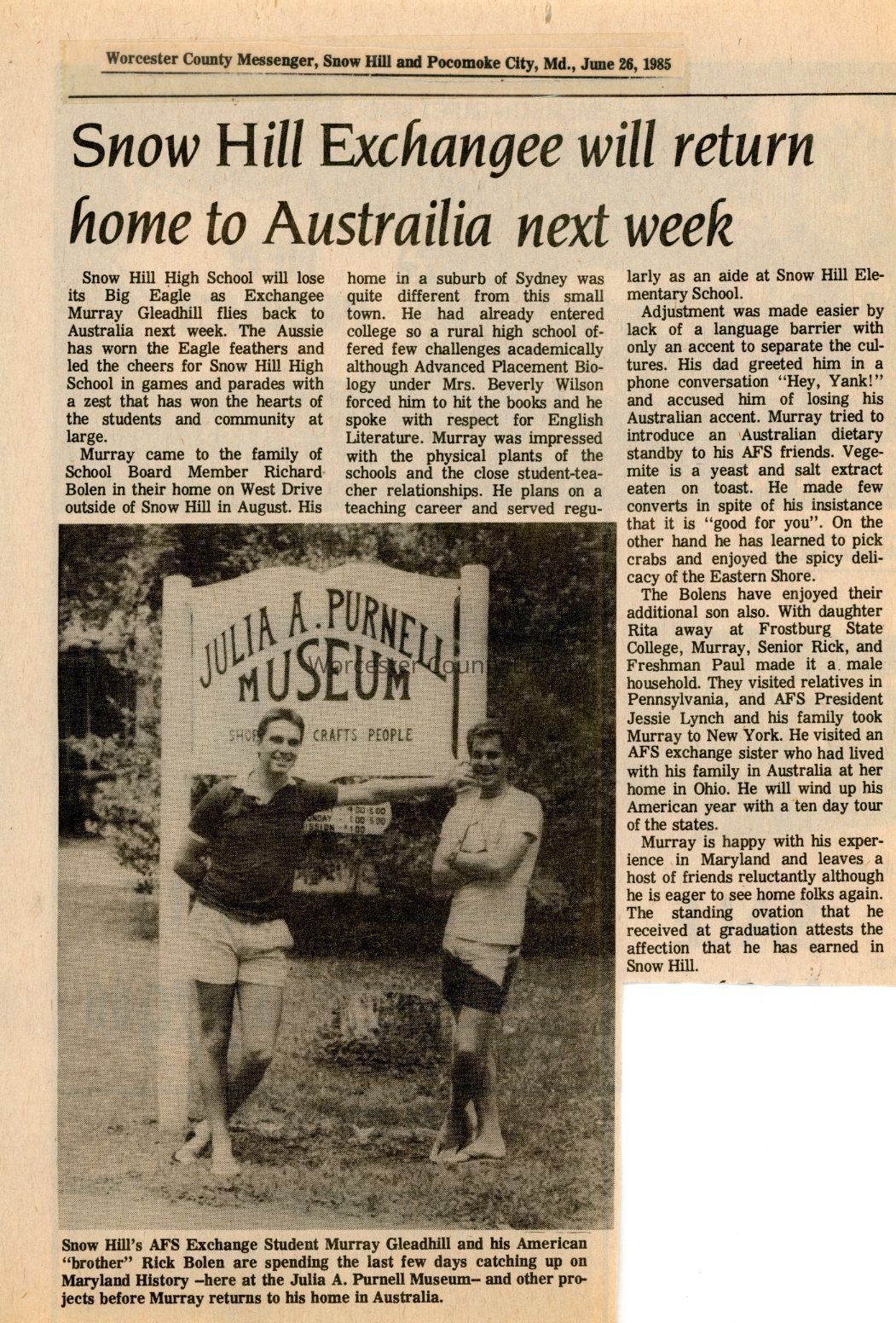 Newspaper clipping, “Snow Hill Exchangee will return home to Australia next week,” June 26, 1985Entry/Object ID