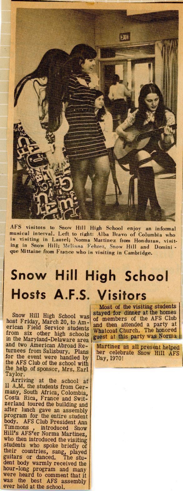 Newspaper clipping, “Snow Hill High School Hosts A.F.S. Visitors,” 1970Entry/Object ID