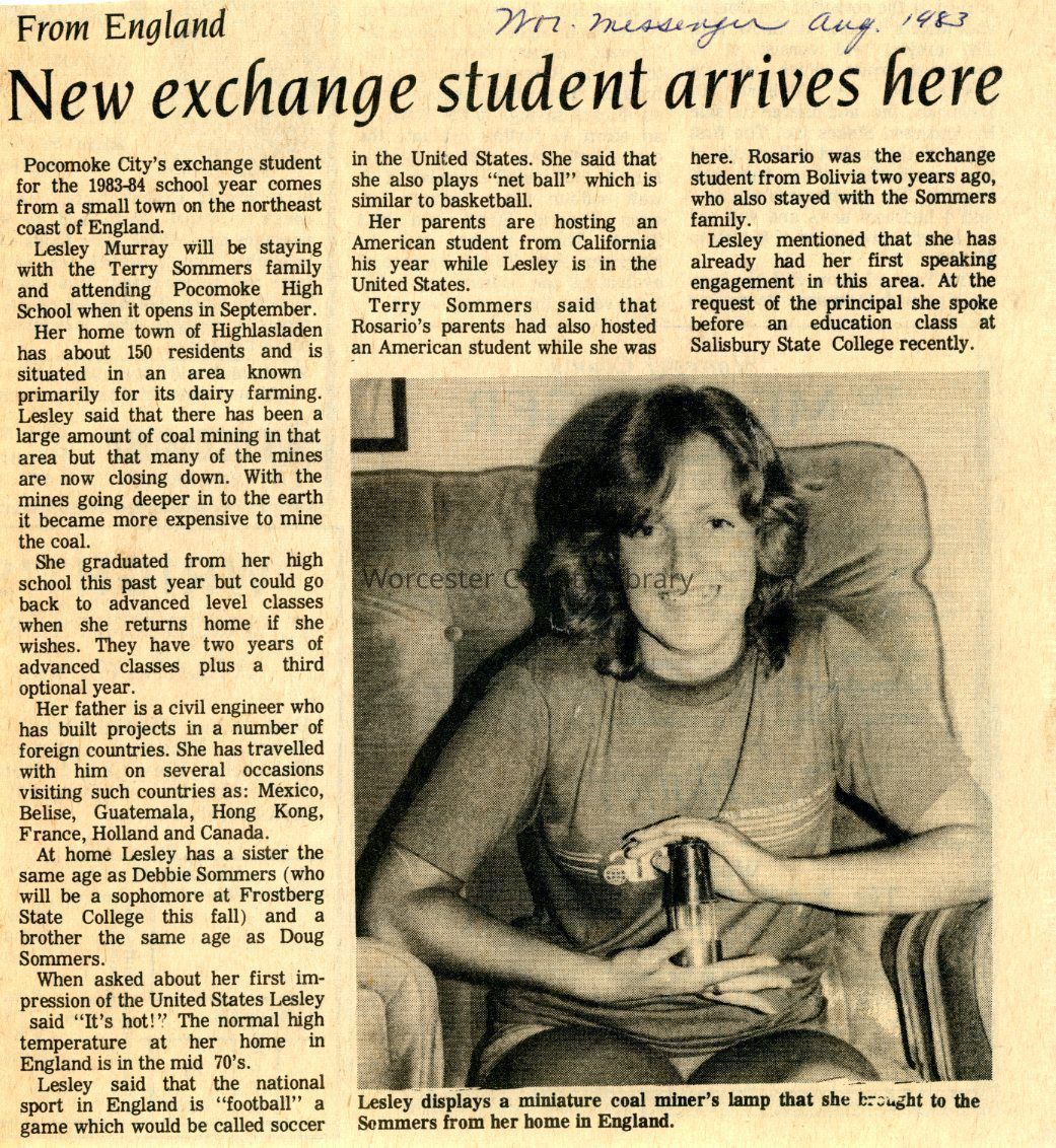 Newspaper clipping, “New exchange student arrives here,” Aug. 1983Entry/Object ID