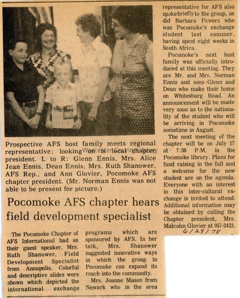Newspaper clipping, “Pocomoke AFS chapter hears field development specialist,” June 29, 1978Entry/Object ID