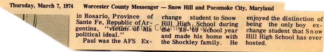 Newspaper clipping, “Former Exchange Student Dies” (Raul Tettamanti), Mar. 7, 1974 (2 pieces)Entry/Object ID