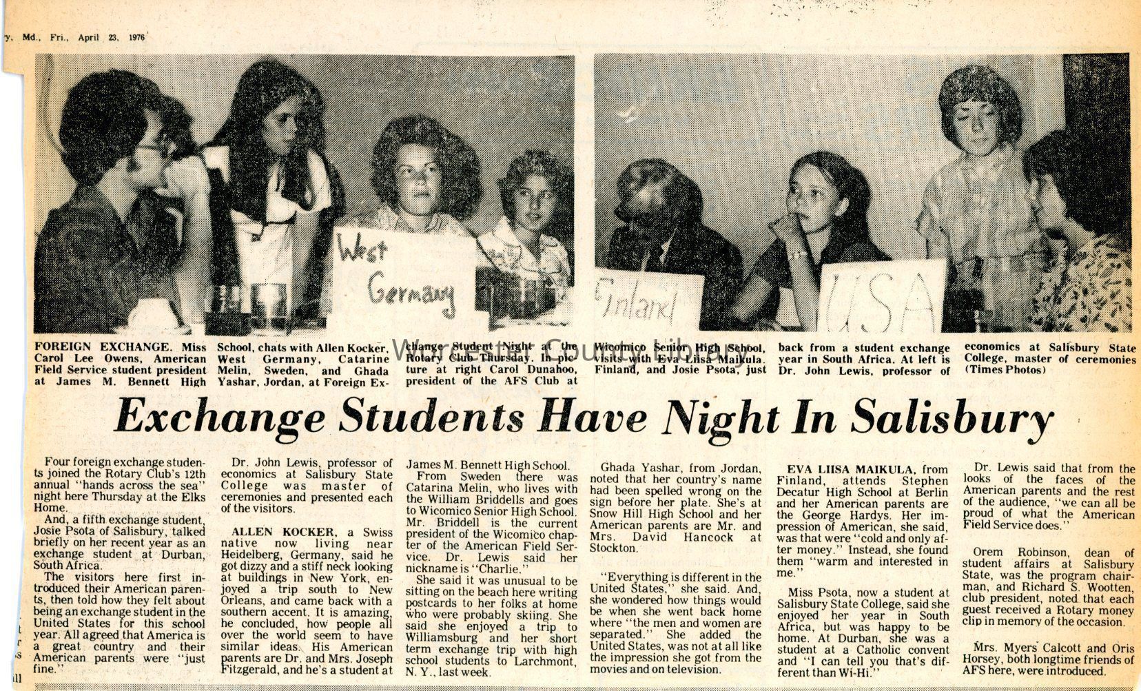 Carol Dunahoo, Mrs. Myers Calcott, Dr. John Lewis, Carol Lee Owens, Josie Psota, Orem Robinson, Richard S. Wootten, William B. Briddell, Mrs. William B. Briddell, Joseph C. Fitzgerald, Mrs. Joseph C. Fitzgerald, Allen Erick Kocker, G. Catarina Melin, George W. Hardy, Mrs. George W. Hardy, Eeva-Liisa A. Nikula, David Wilson Hancock, Jr., Dorothy Pearl Ward Hancock, Oris Horsey, Ghada Mohammed Yashar