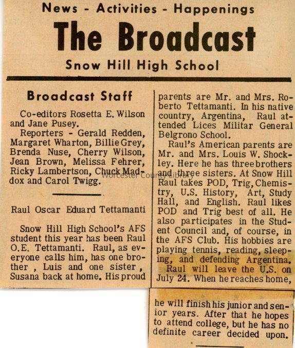 Jean Brown, Melissa Denise Fehrer-Wanner, Billie Grey, Ricky Lambertson, Chuck Maddox, Lucinda Lee Shockley McDowell, Brenda Nuse, Jane Pusey, Gerald Redden, Louis William Shockley, Jr., Lane Edsel Shockley, Larry Gene Shockley, Loretta Ann Herpel Shockley, Louis William Shockley, Sr., Lois Ann Shockley Sirman, Loretta Lynn Shockley Sturgis, Luis Tettamanti, Raul Oscar Eduard Tettamanti, Roberto Tettamanti, Mrs. Roberto Tettamanti, Susana Tettamanti, Carol Jean Twigg Hales, Margaret Wharton, Cherry Wilson, Rosetta E. Wilson, Snow Hill High School, American Field Service