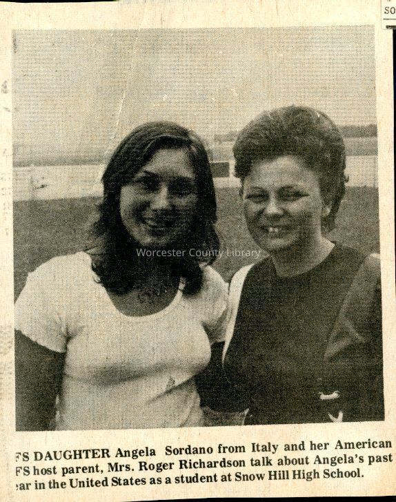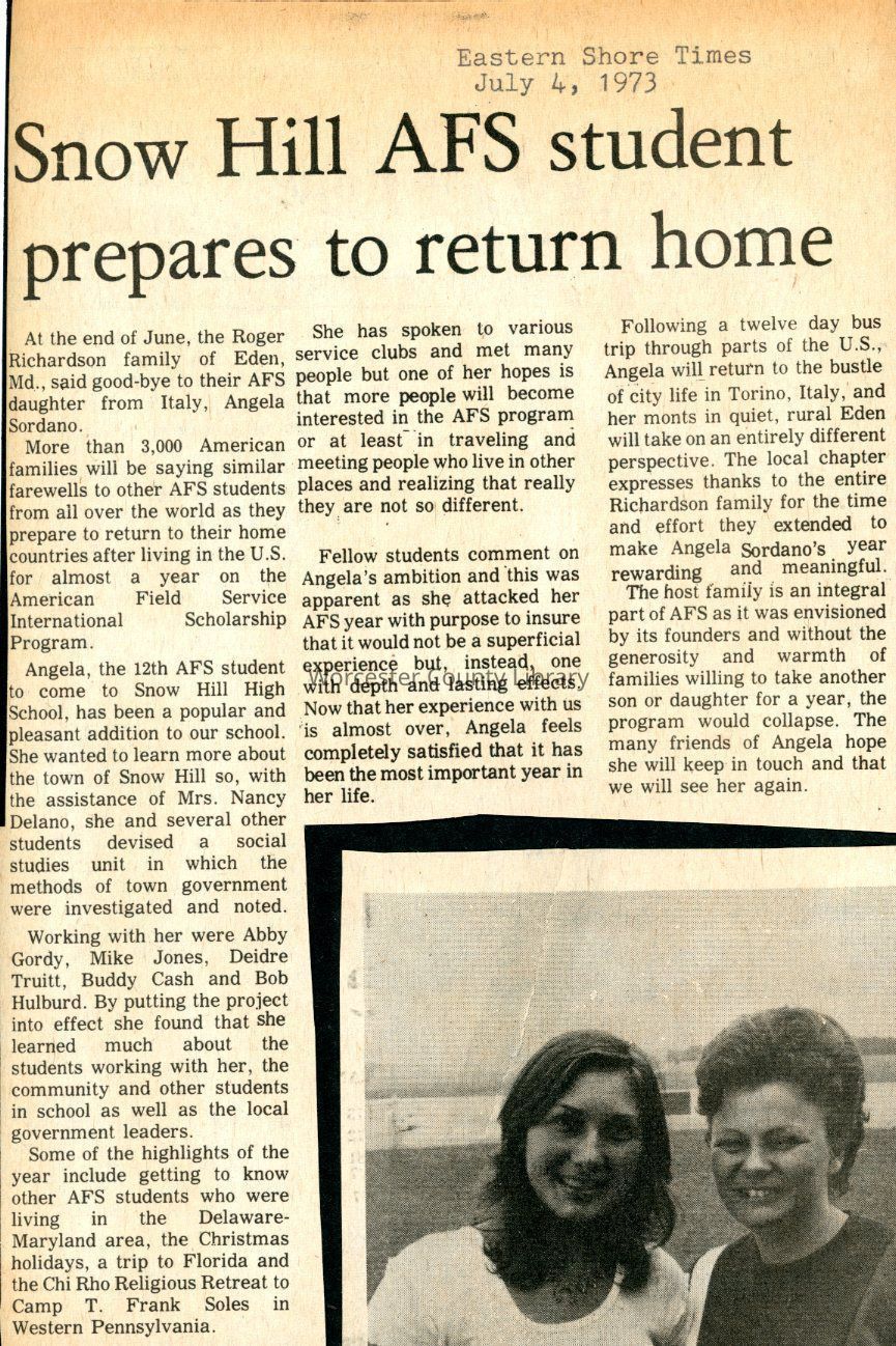 Newspaper clipping, “Snow Hill AFS student prepares to return home” (Angela Sordano), July 4, 1973Entry/Object ID