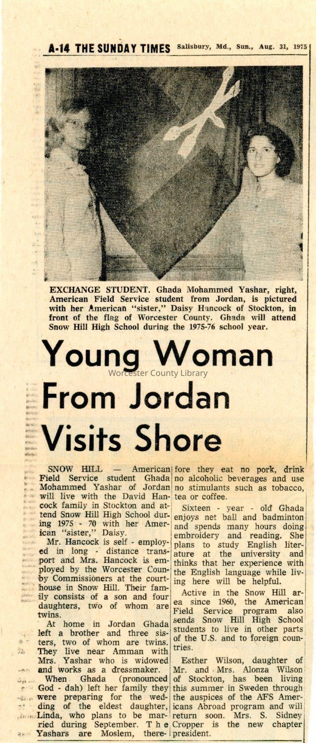 Newspaper clipping, “Young Woman From Jordan Visits Shore” (Ghada Yashar), Aug. 31, 1975Entry/Object ID
