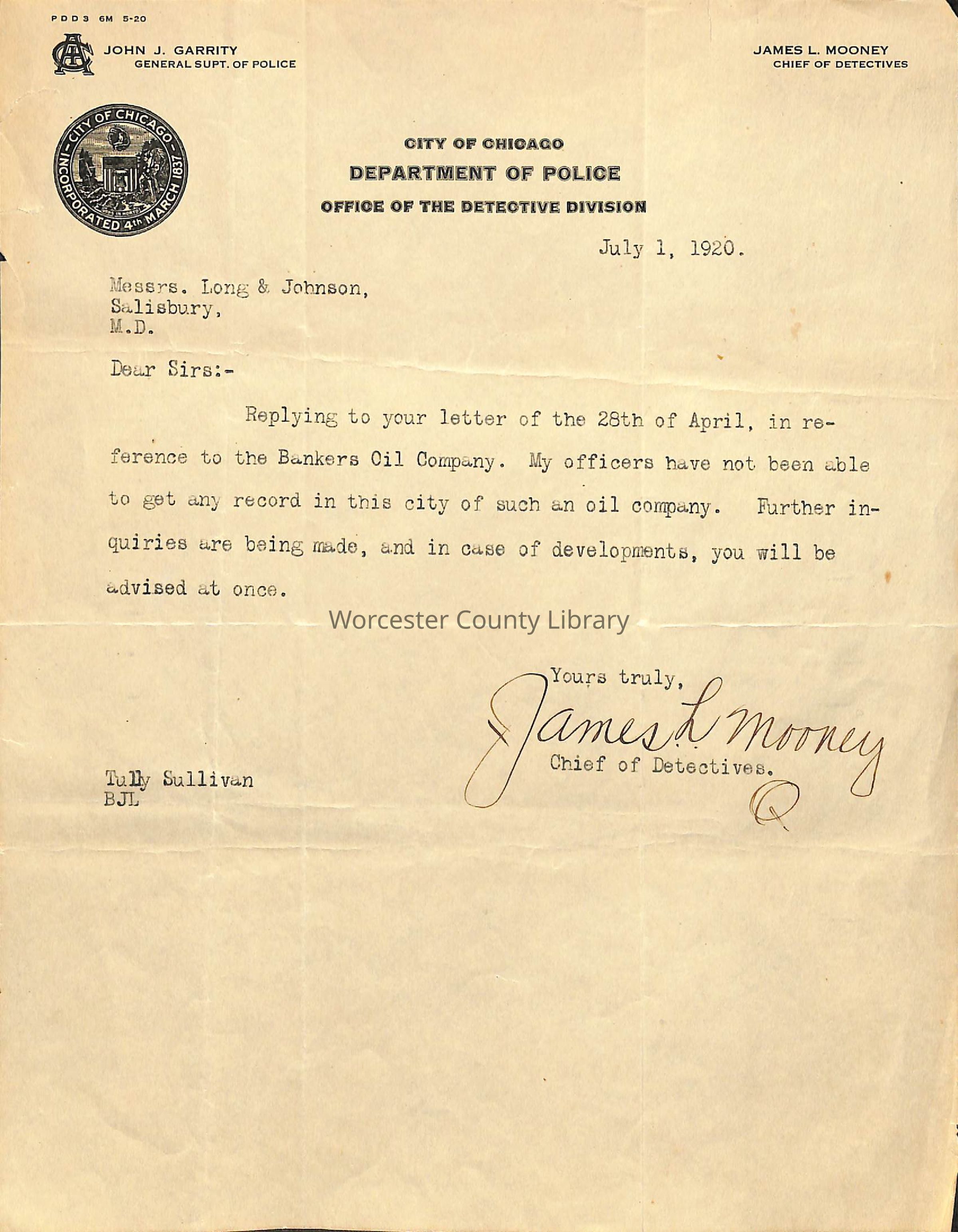 Bank Correspondence, City of Chicago Dept. of Police, July 1, 1920Entry/Object ID