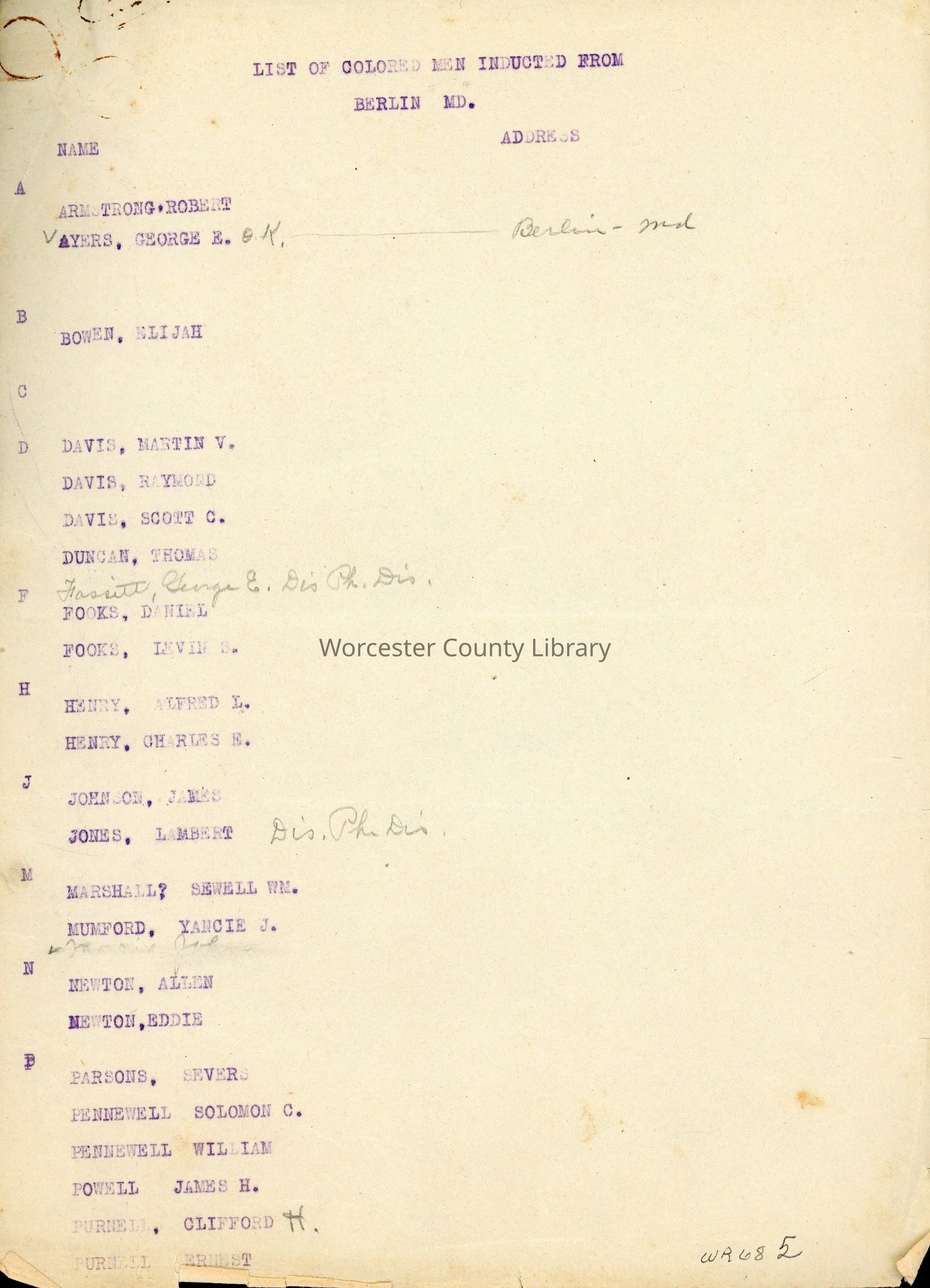 List of Colored Men Inducted from Berlin, MD., World War IEntry/Object ID
