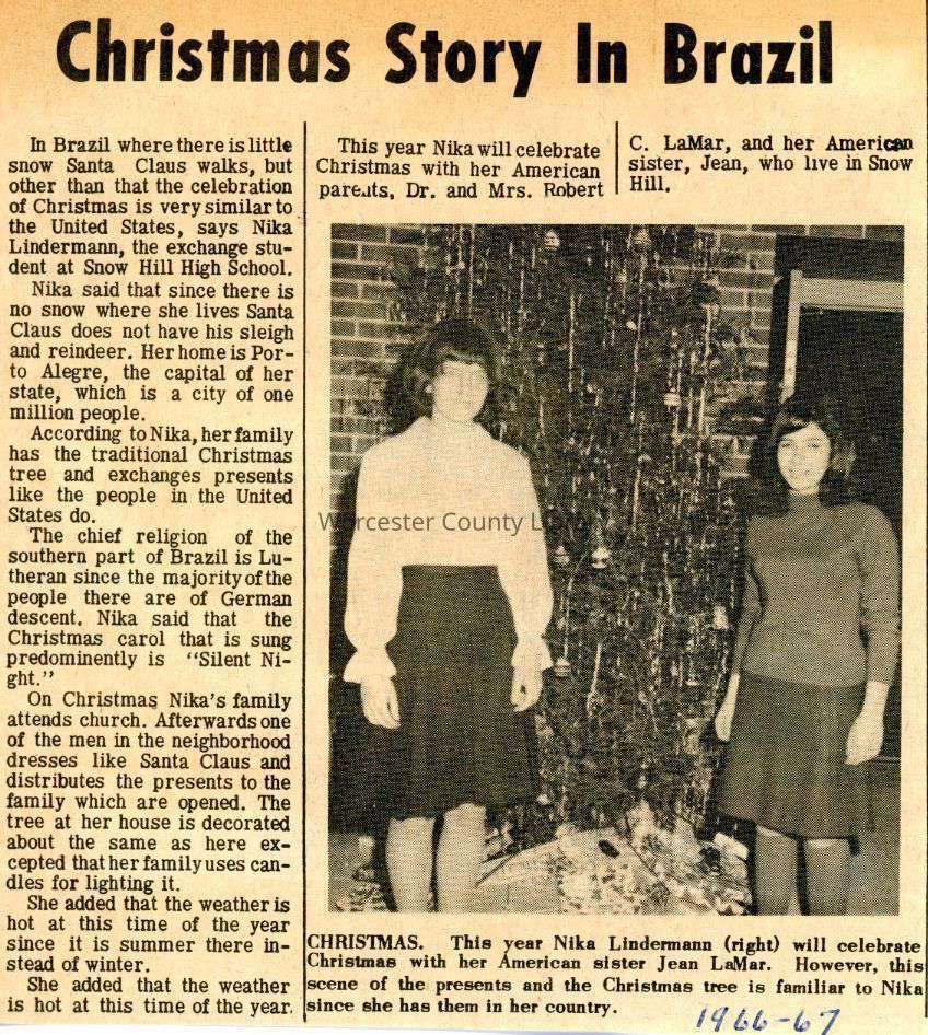 In Brazil where there is little snow Santa Claus walks, but other than that the celebration of Christmas is very similar to the United States, says Nika Lindermann, the exchange student at Snow Hill High School.