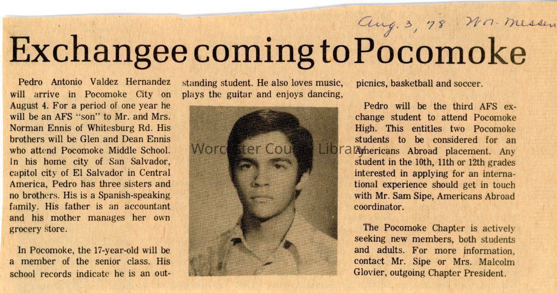 Newspaper clipping, “Exchangee coming to Pocomoke” (Pedro Hernandez), Aug. 3, 1978Entry/Object ID