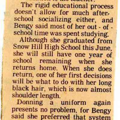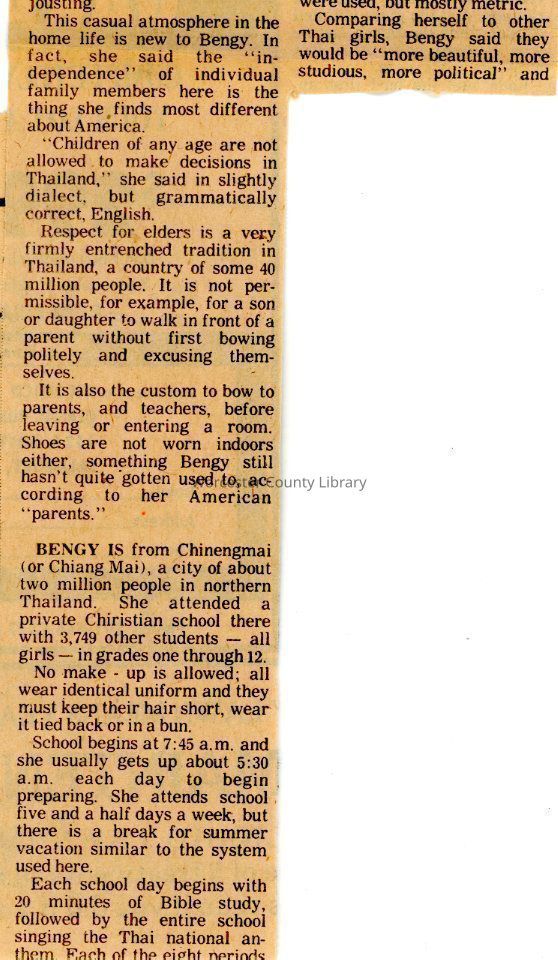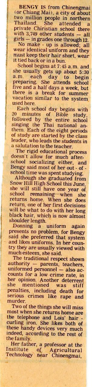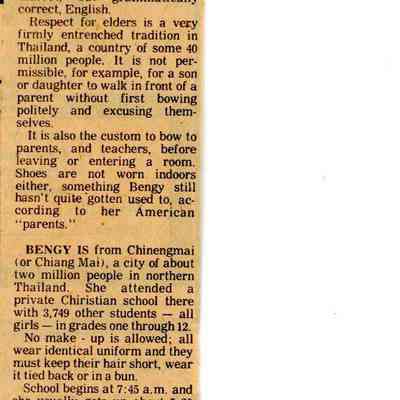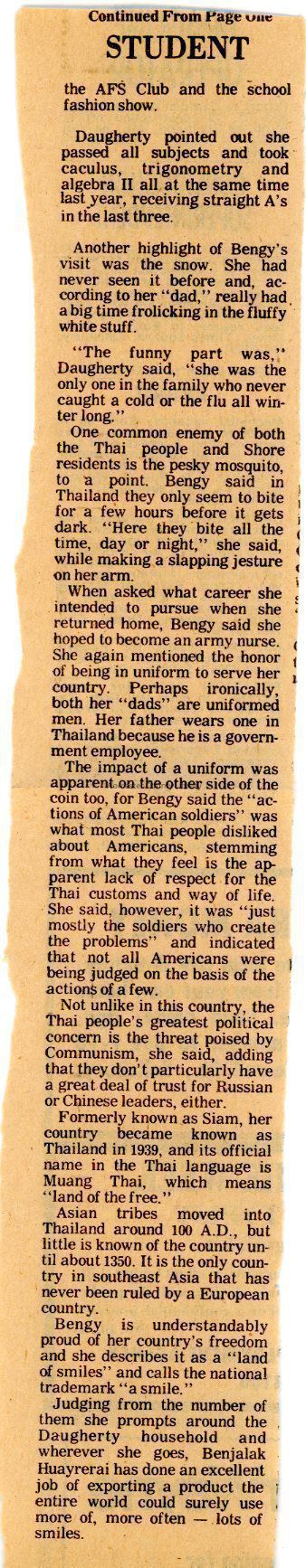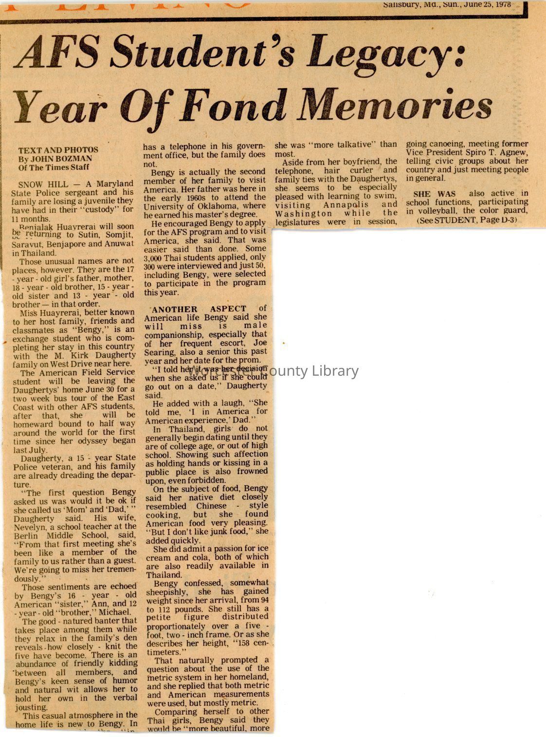 Newspaper clipping, “AFS Student’s Legacy: Year of Fond Memories” (Benjalak Huayrerai), June 25, 1978Entry/Object ID