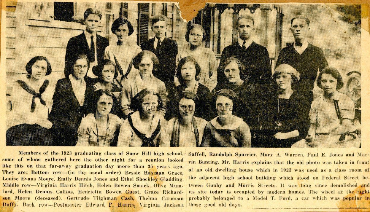 Snow Hill High School, Bessie Stagg Hayman Grace, Louise Evans Moore, Emily Dennis Jones, Ethel Shockley Bromley Gladding, Virginia Mae Harris Hitch Bounds, Helen Bowen Smack, Olive Mumford, Helen Dennis Collins, Henrietta Donovan Bowen Guest, Grace Richardson Moore, Gertrude Tilghman Cash, Thelma Carmean Duffy, Edward P. Harris, Virginia Jackson Saffel, Randolph Spurrier, Mary Avery Warren, Paul Elton Jones, Marvin Bunting