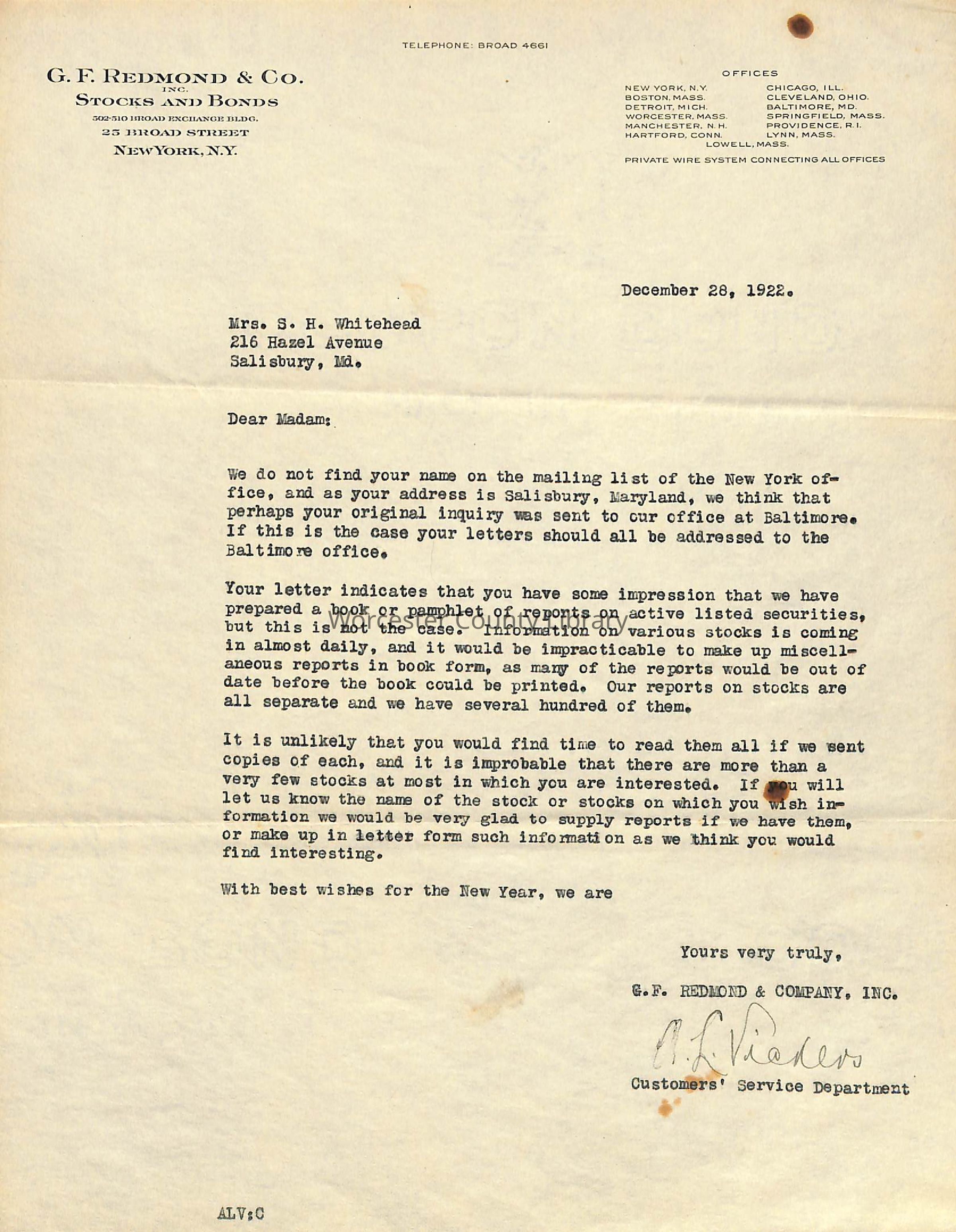 Bank Correspondence, G. F. Redmond & Co. Inc., Dec. 28, 1922Entry/Object ID