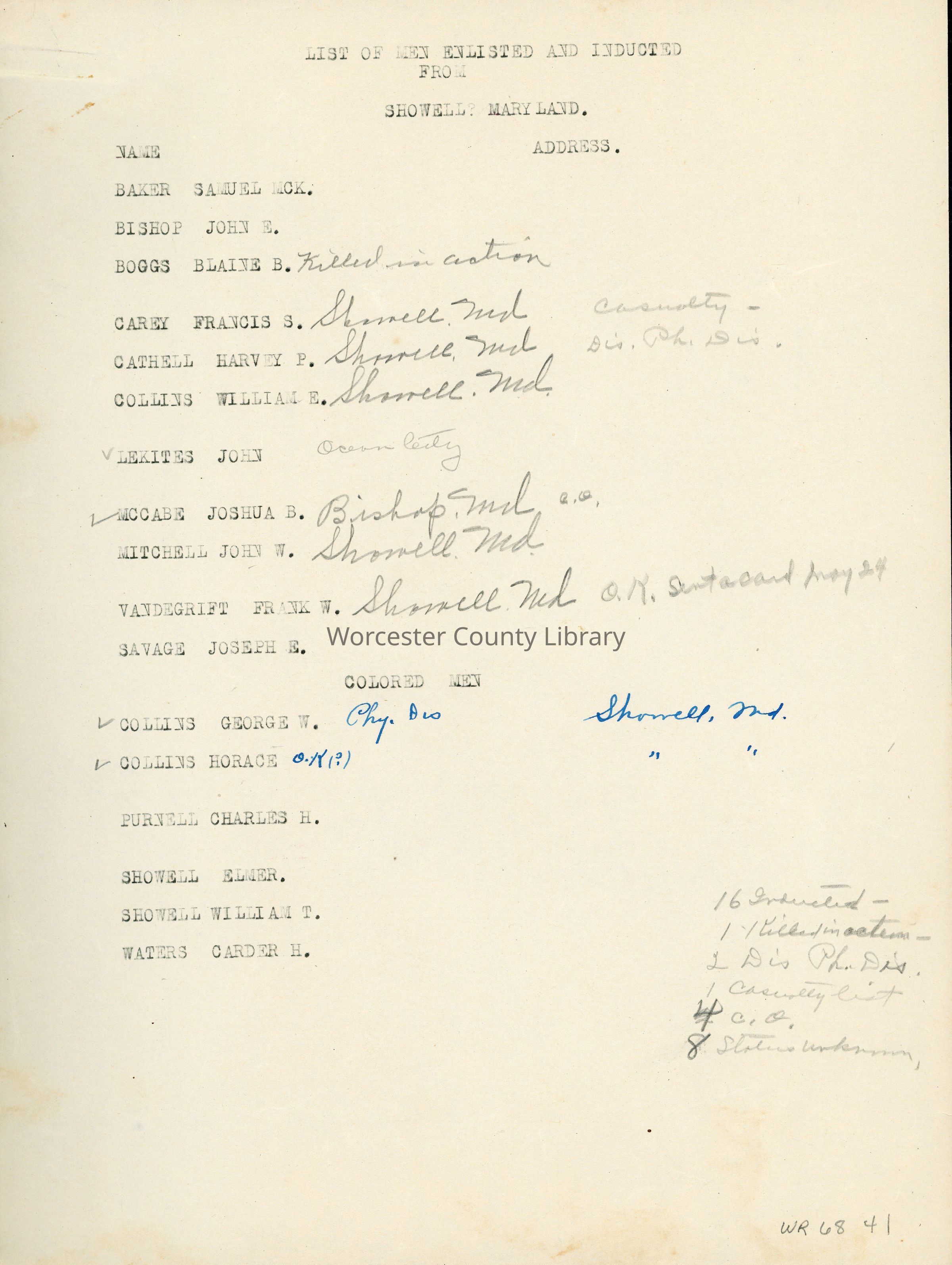 List of Men Enlisted and Inducted from Showell, Maryland, World War IEntry/Object ID