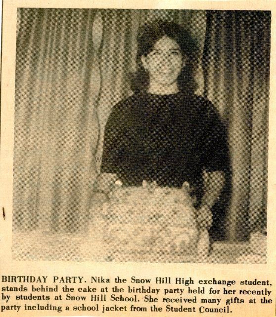 BIRTHDAY PARTY. Nika the Snow Hill High exchange student, stands behind the cake at the birthday party held for her recently by students at Snow Hill High School. She received many gifts at the party including a school jacket from the Student Council.Relationships