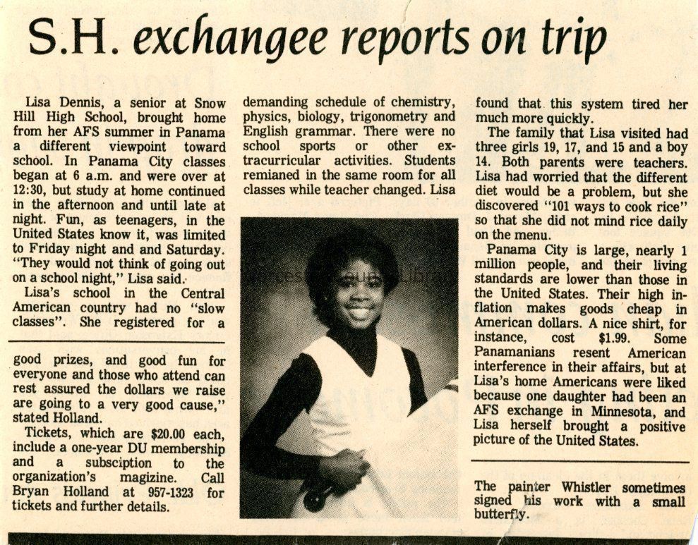 Newspaper clipping, “S.H. exchangee reports on trip,” 1985Entry/Object ID