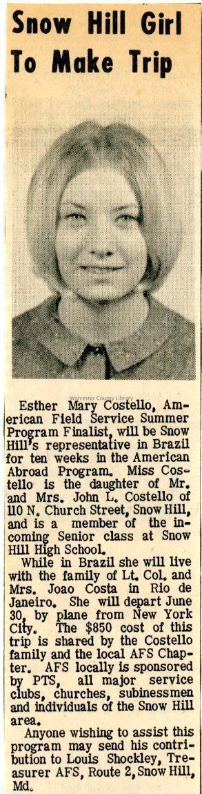 Esther Mary Costello Chan Chapman, Joao Costa, Mrs. Joao Costa, John L. Costello, Sr., Alice Giesen Costello, American Field Service, Snow Hill High SchoolCreated By
