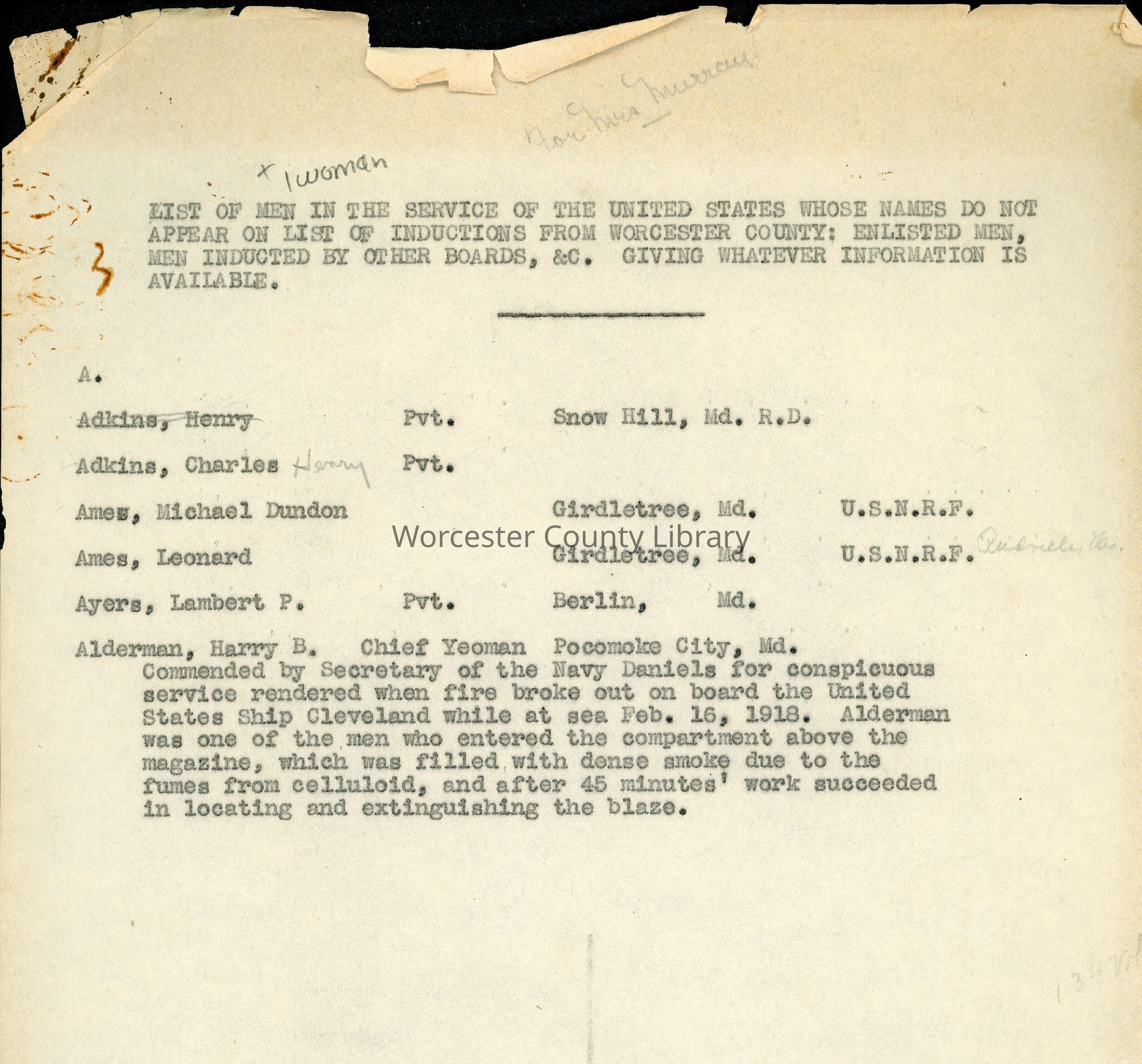 List of men (and 1 woman) in the service of the United States whose names do not appear on list of inductions from Worcester County, World War IEntry/Object ID