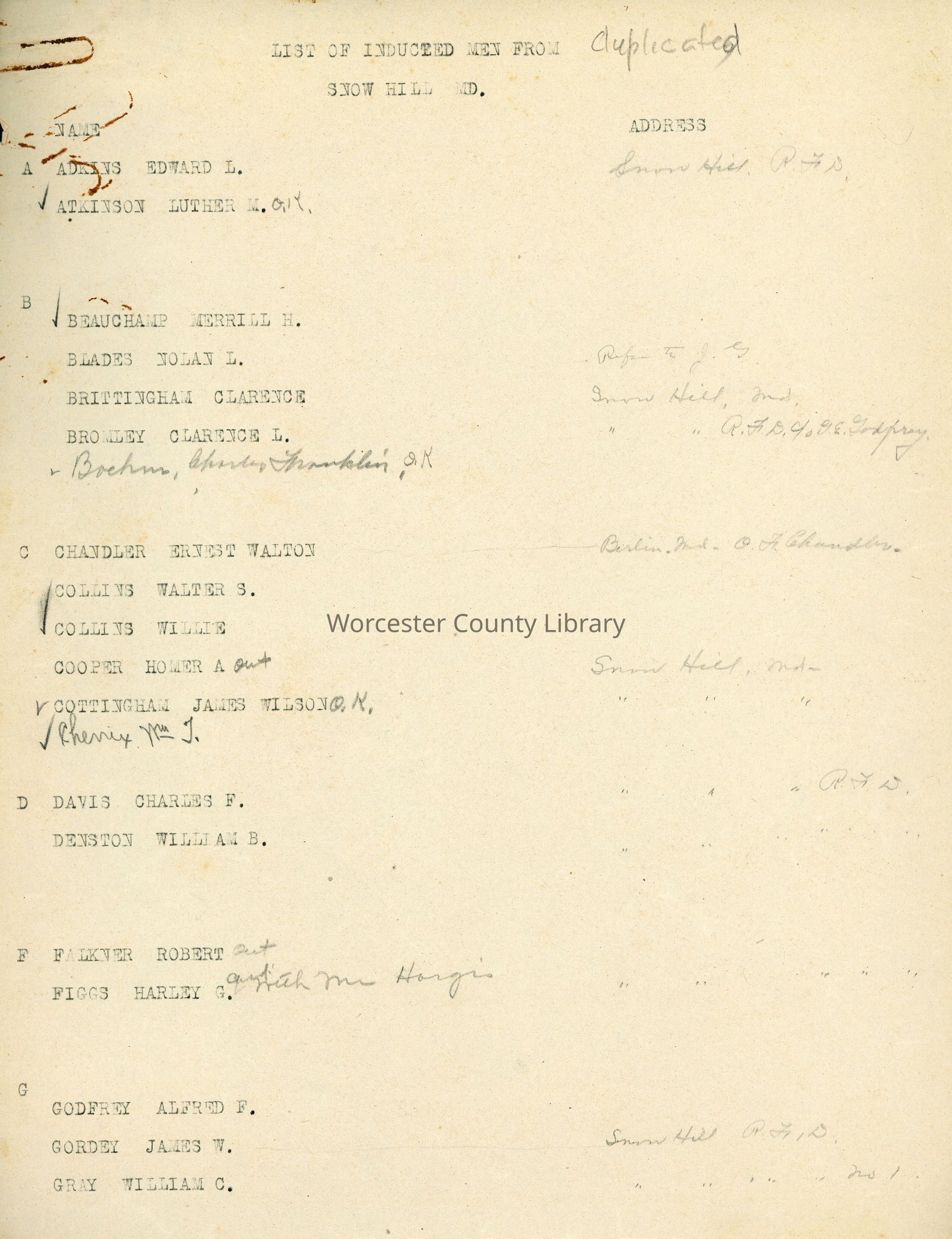 List of Inducted Men from Snow Hill, MD., World War IEntry/Object ID