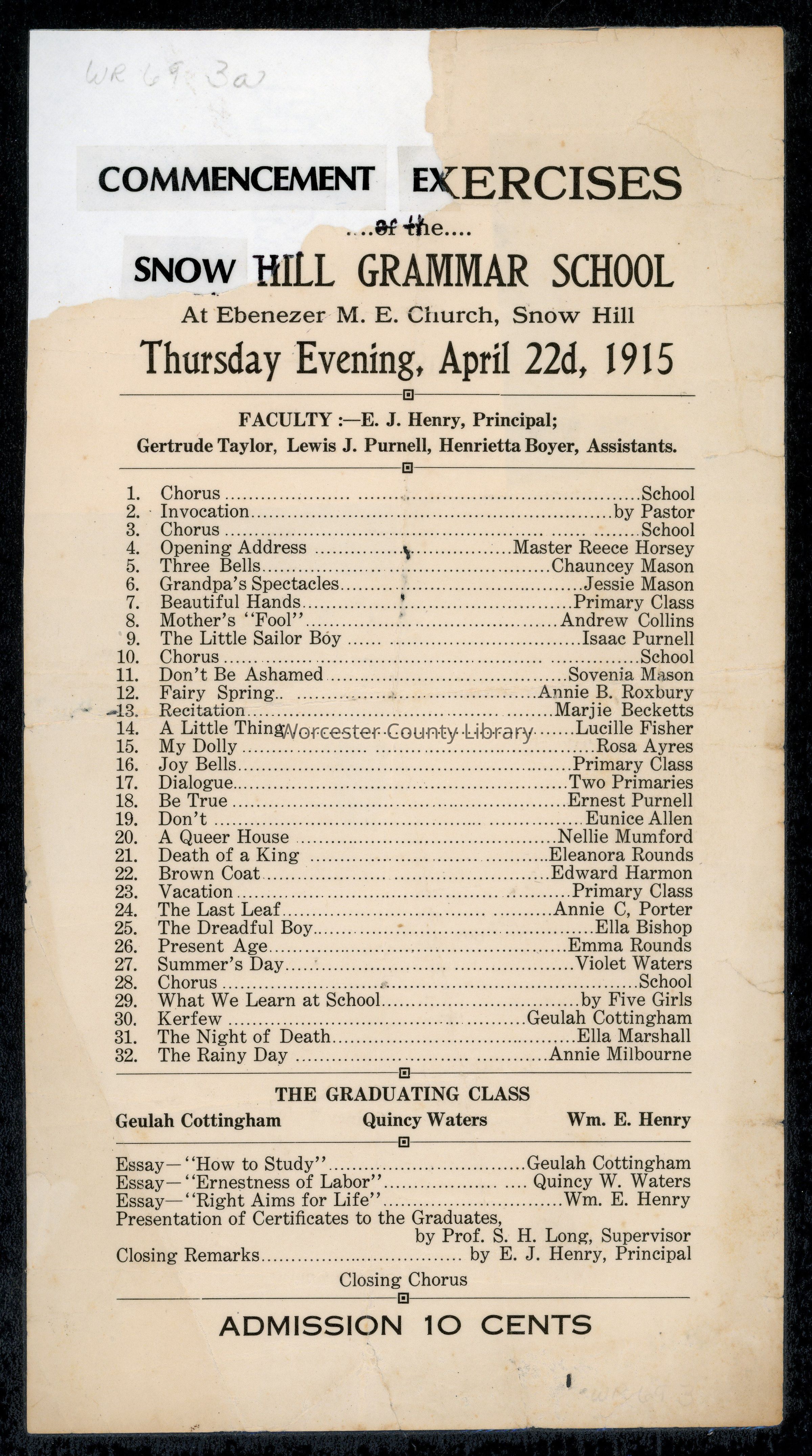 Snow Hill Grammar School, Ebenezer Methodist Episcopal Church, E. J. Henry, Gertrude Taylor, Lewis J. Purnell, Henrietta Boyer, Reece Horsey, Chauncey Mason, Jessie Mason, Andrew Collins, Isaac Purnell, Sovenia Mason, Annie B. Roxbury, Marjie Becketts, Lucille Fisher, Rosa Ayres, Ernest Purnell, Eunice Allen, Nellie Mumford, Eleanora Rounds, Edward Harmon, Annie C. Porter, Ella Bishop, Emma Rounds, Violet Waters, Geulah Cottingham, Ella Marshall, Annie Milbourne, Quincy W. Waters, William E. Henry, S. H. Long