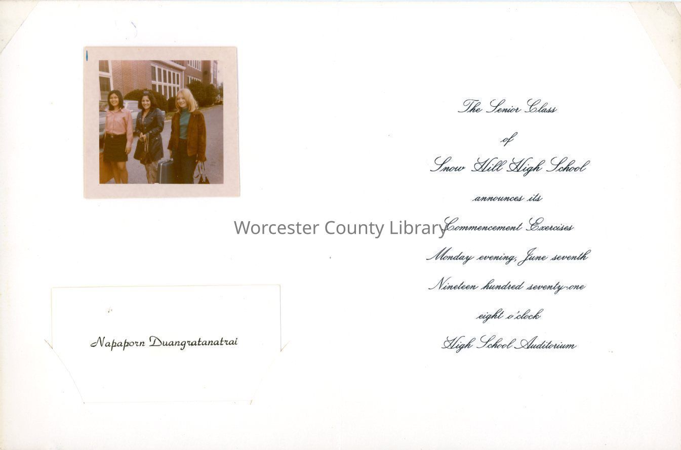 Commencement invitation, Snow Hill High School, Napaporn Daungratantrai and photograph of Napaporn, Esther Costello and another girl, June 1971Entry/Object ID
