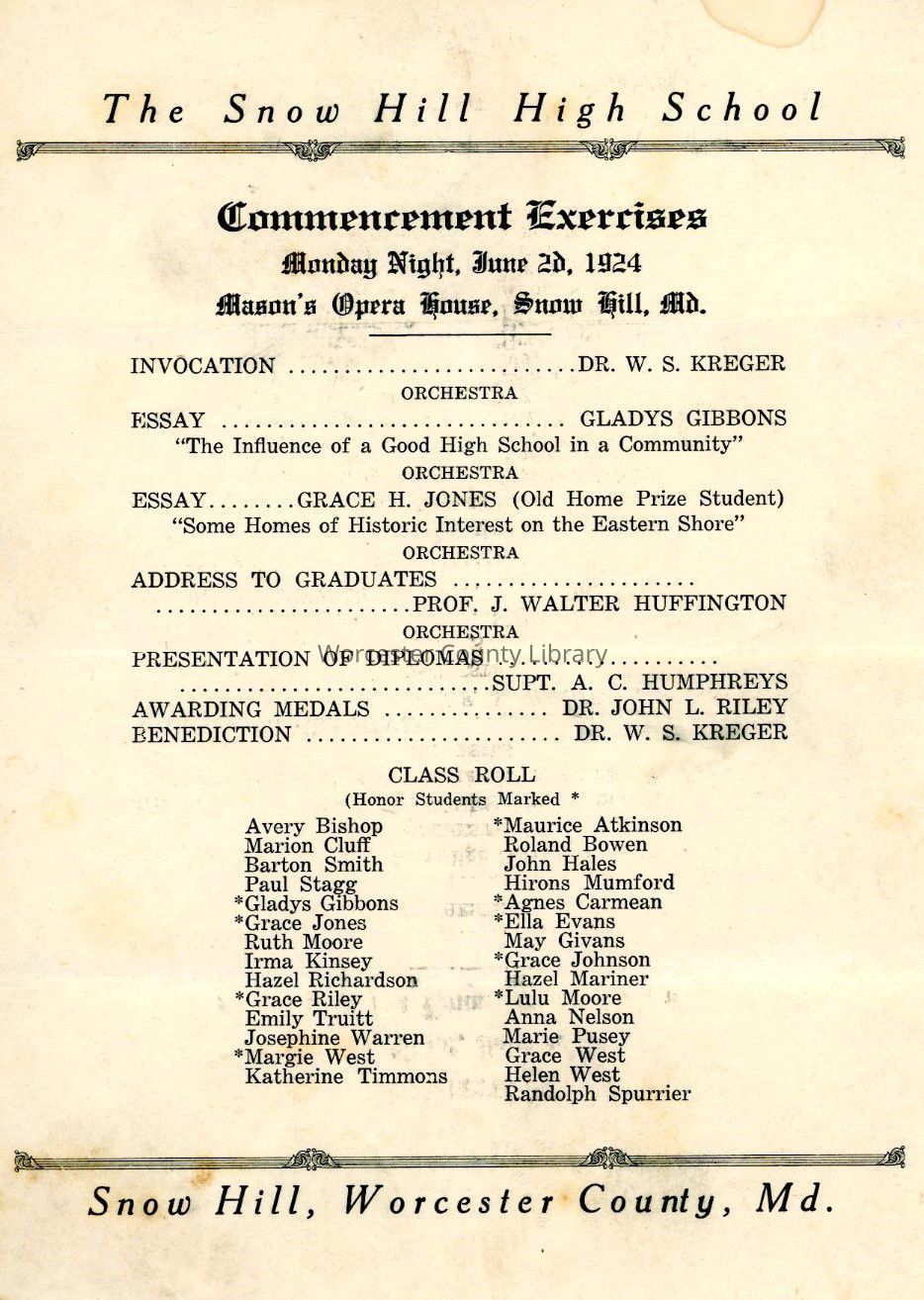 Snow Hill High School, Mason's Opera House, W. S. Kreger, Gladys Irene Gibbons, Grace H. Jones, J. Walter Huffington, Arthur Carroll Humphreys, Sr., John L. Riley, Avery Bishop, Robert Marion Cluff, Barton Smith, Paul Stagg, Ruth Moore, Irma V. Kensey Jones, Hazel Richardson, Grace Riley, Emily Truitt Duley, Josephine Warren, Margie Elizabeth West Myers, Katherine Timmons, Maurice Atkinson, Roland Bowen, John Hales, Hirons William Mumford, Agnes Carmean, Ella Evans, May Givans, Grace Johnson, Hazel Mariner Parks, Lulu Moore, Anna Nelson, Marie Pusey, Grace West, Helen West, Randolph Spurrier