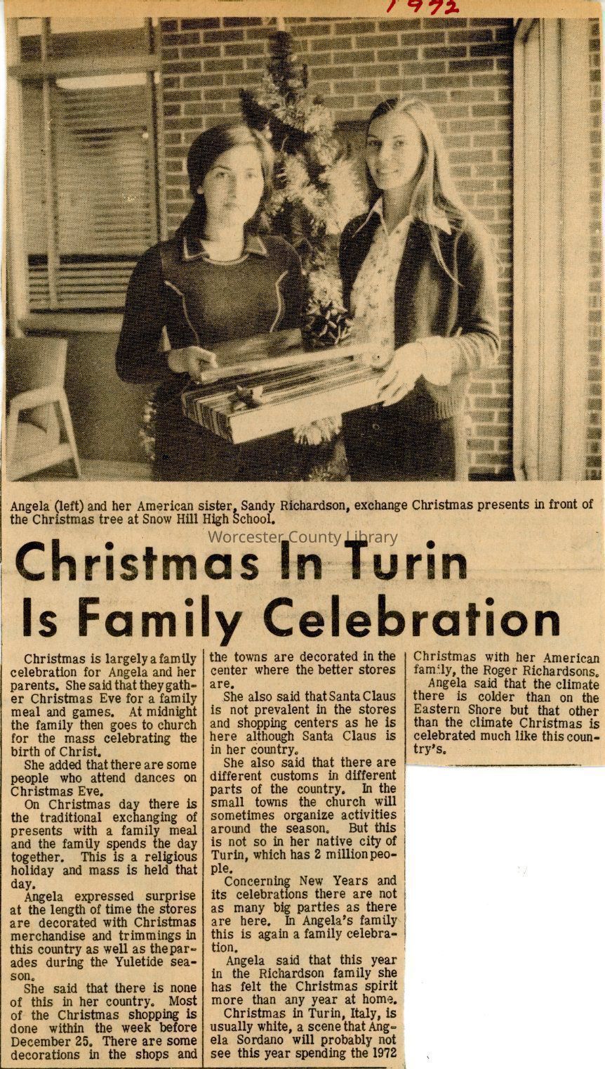 Newspaper clipping, “Christmas in Turin is Family Celebration” (Angela Sordano), 1972Entry/Object ID
