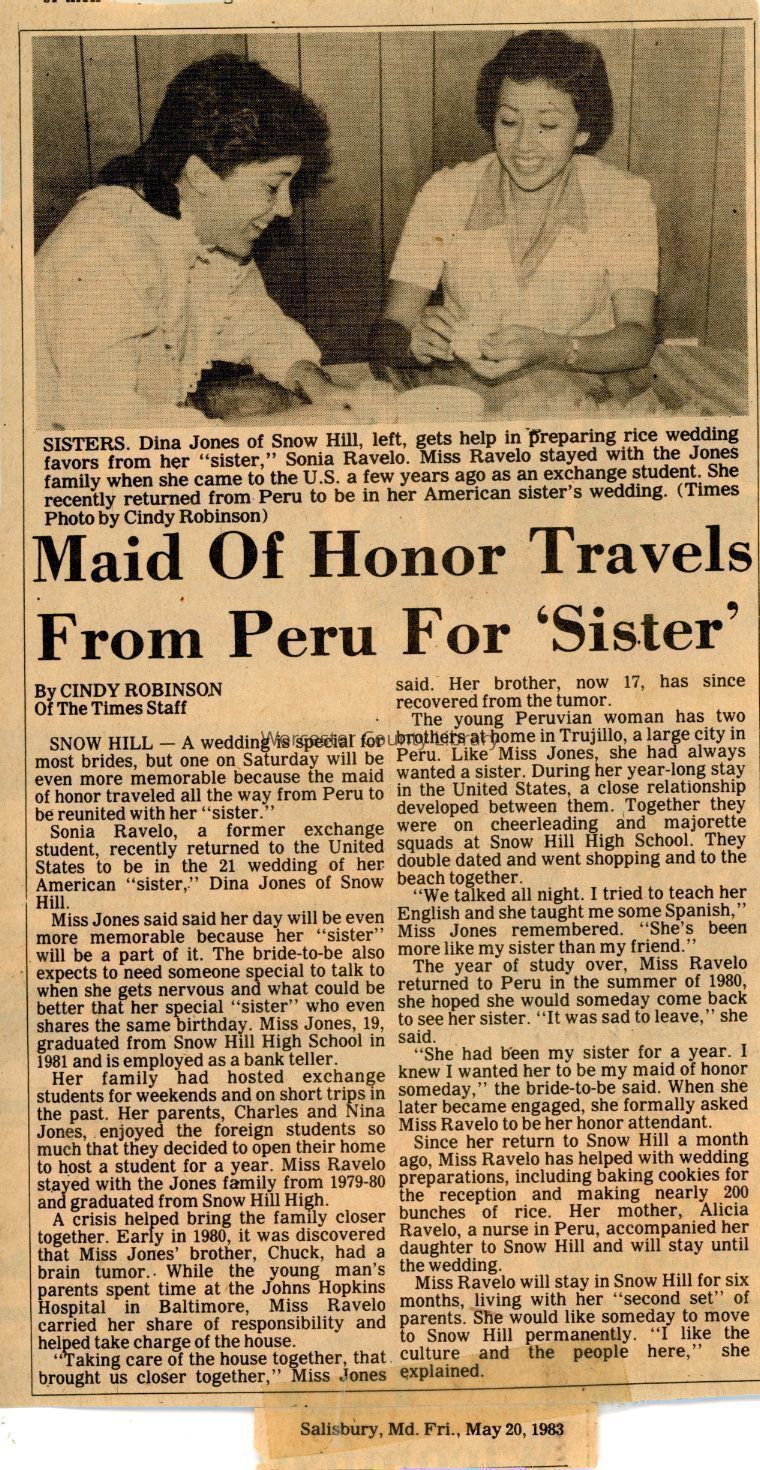 Newspaper clipping, “Maid of Honor Travels From Peru For ‘Sister,’” May 20, 1983Entry/Object ID