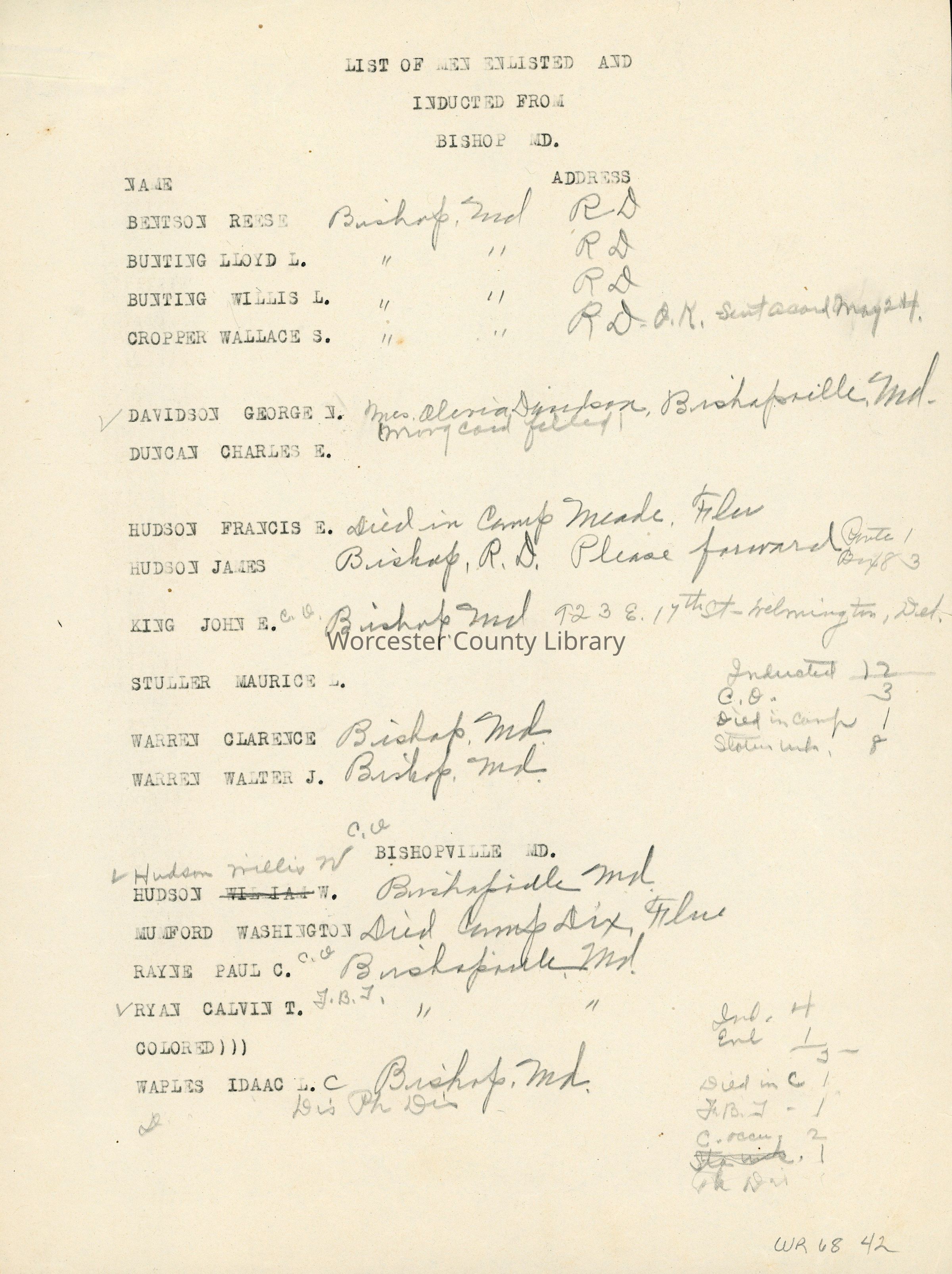List of Men Enlisted and Inducted from Bishop, MD., World War IEntry/Object ID