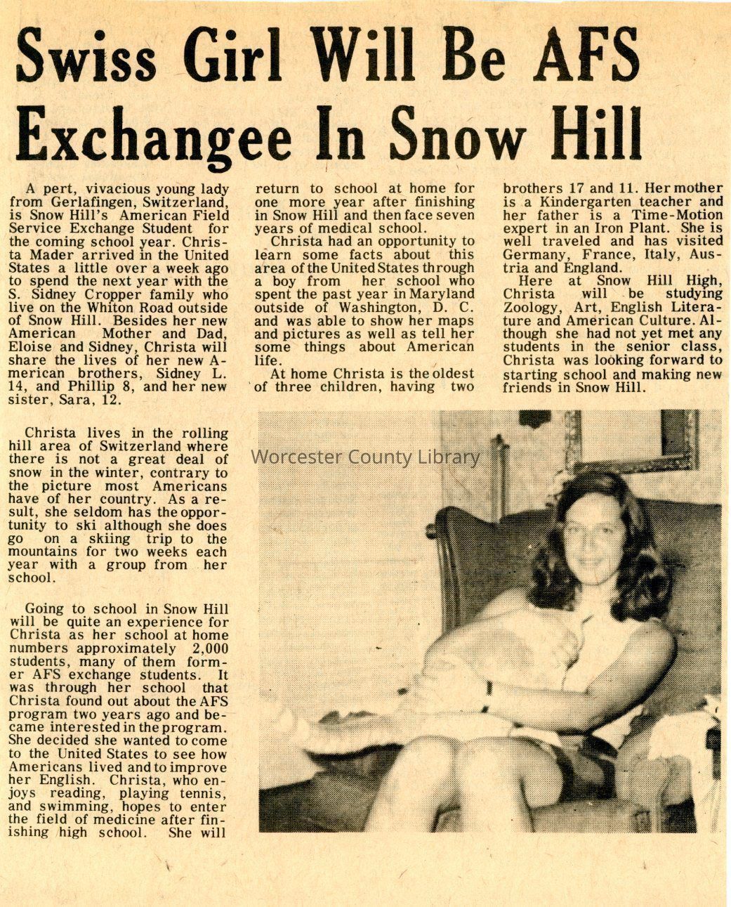 Newspaper clipping, “Swiss Girl Will be AFS Exchangee in Snow Hill” (Christa Mader), Sept. 1973Entry/Object ID