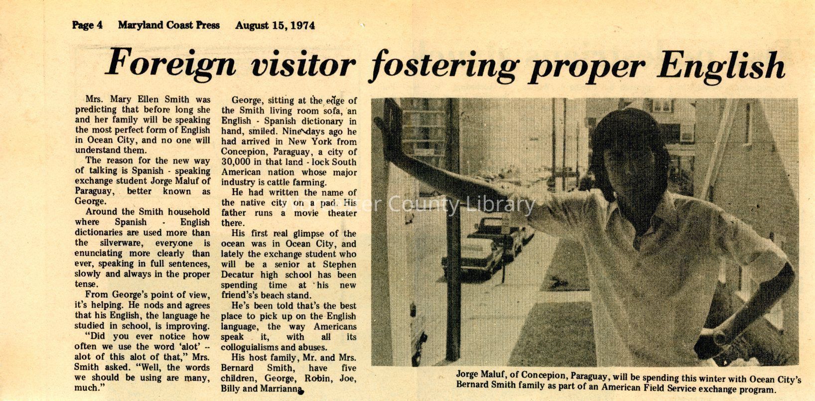 Newspaper clipping, “Foreign visitor fostering proper English” (Jorge Maluf), Aug. 15, 1974Entry/Object ID