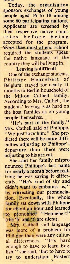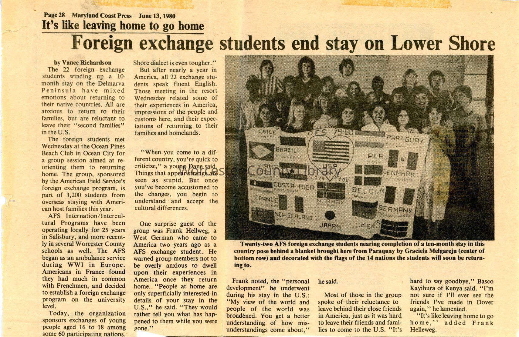 Newspaper clipping, “Foreign exchange students end stay on Lower Shore,” June 13, 1980Entry/Object ID