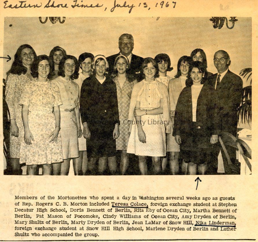 Members of the Mortonettes who spent a day in Washington several weeks ago as guests of Rep. Rogers C. B. Morton included Teresa Colace, foreign exchange student at Stephen Decatur High School, Doris Bennett of Berlin, Rita Eby of Ocean City, Martha Bennett of Berlin, Pat Mason of Pocomoke, Cindy Williams of Ocean City, Amy Dryden of Berlin, Mary Shultz of Berlin, Marty Dryden of Berlin, Jean LaMar of Snow Hill, Nika Linderman, foreign exchange student at Snow Hill High School, Marlene Dryden of Berlin and Luther Shultz who accompanied the group.