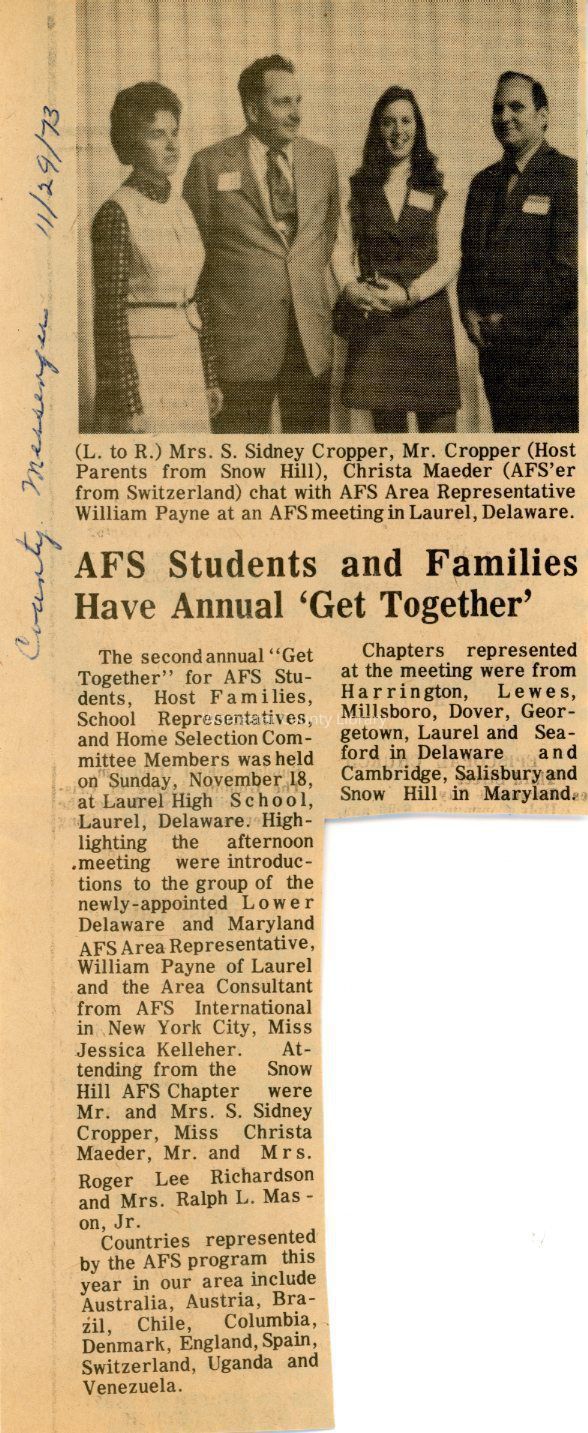 Newspaper clipping, “AFS Students and Families Have Annual Get Together,” Nov. 29, 1973Entry/Object ID