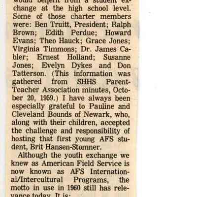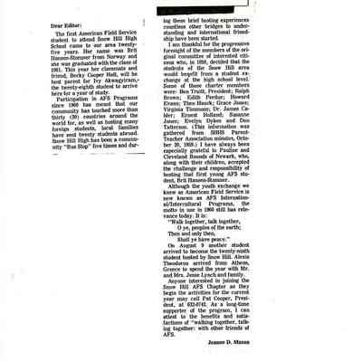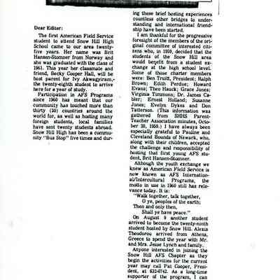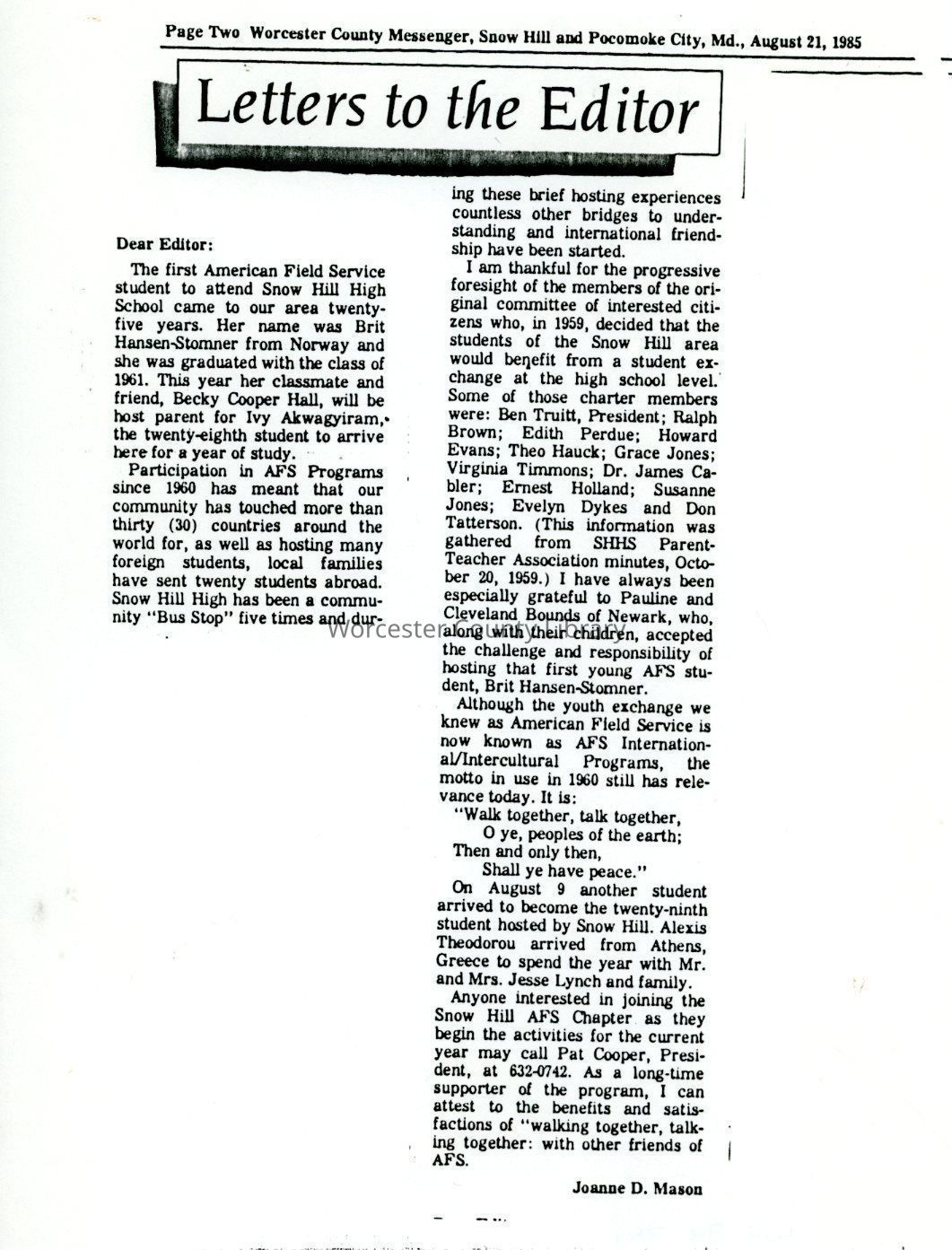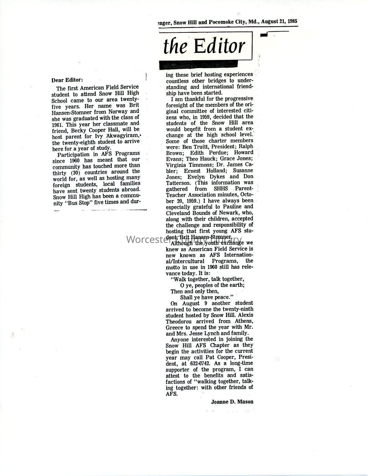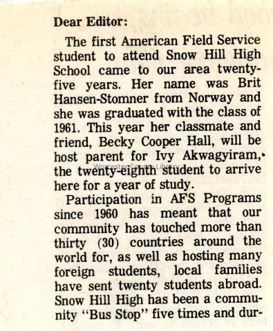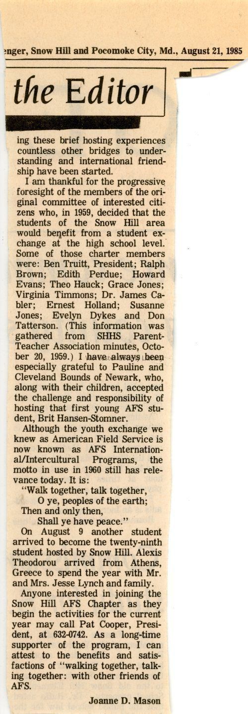 American Field Service, Snow Hill High School, Britt Magna Hansen-Stomner Bohnsdalen, Becky Cooper Hall, Ivy Louise Akwagyiram, Benjamin T. Truitt, Ralph Brown, Edith Chandler Perdue, Howard E. Evans, Theo Ramsay Hauck, Grace Jones, Frances Virginia Cropper Timmons, James T. Cabler, Suzanne Jones, Evelyn Dykes, Donald Tatterson, Snow Hill Parent-Teacher Association, Pauline Ellen Cropper Bounds, Rodney Cleveland Bounds, Jr., Alexis Theodorou, Jesse Lynch, Mrs. Jesse Lynch, Pat Cooper, Joanne Dickerson Mason, Ernest Holland
