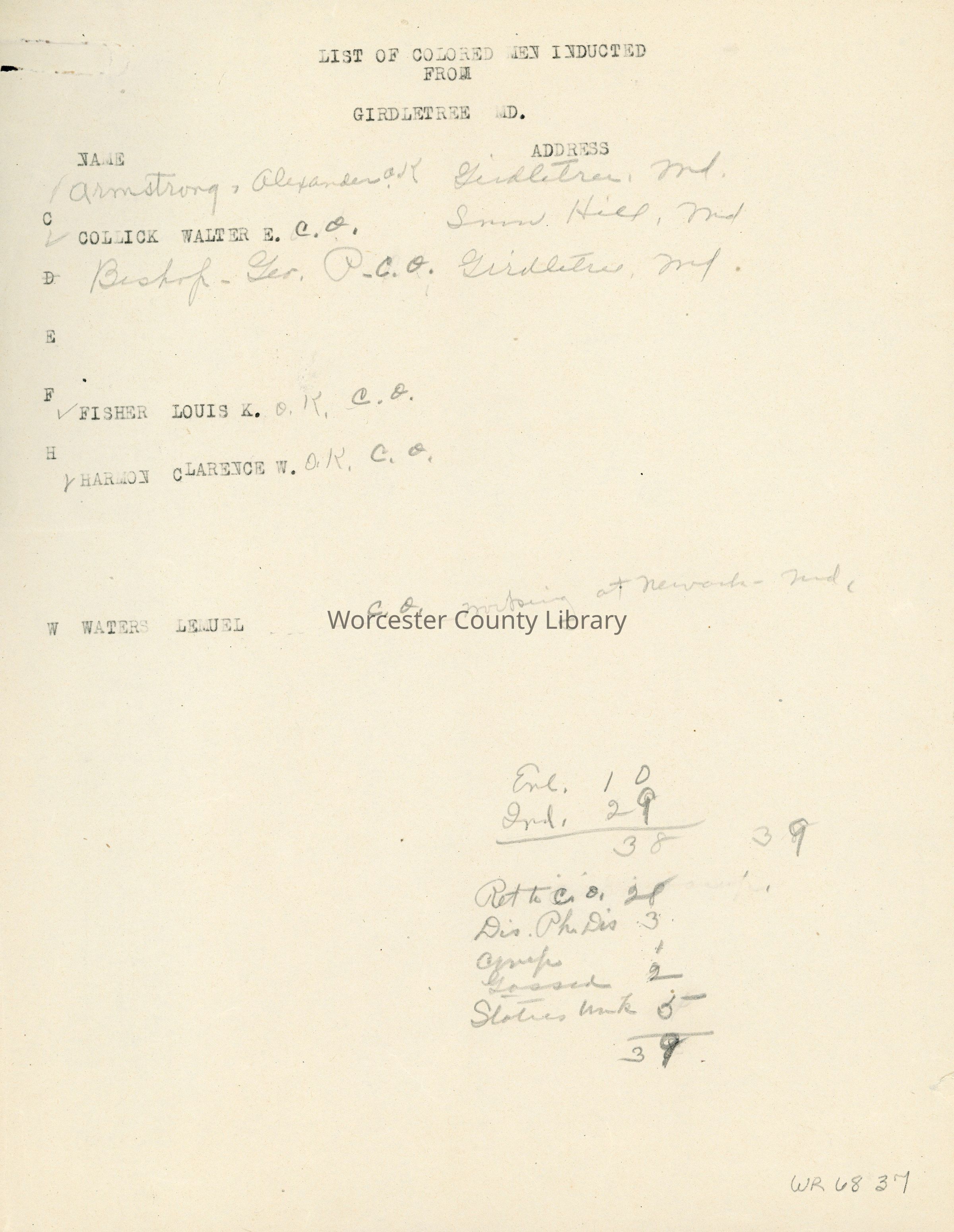 List of Colored Men Inducted from Girdletree, MD., World War IEntry/Object ID