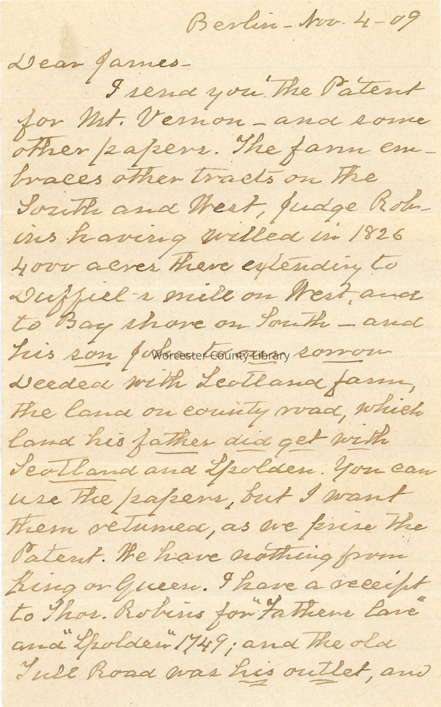Correspondence, E. A. Robins to James Robins, 1909Entry/Object ID
