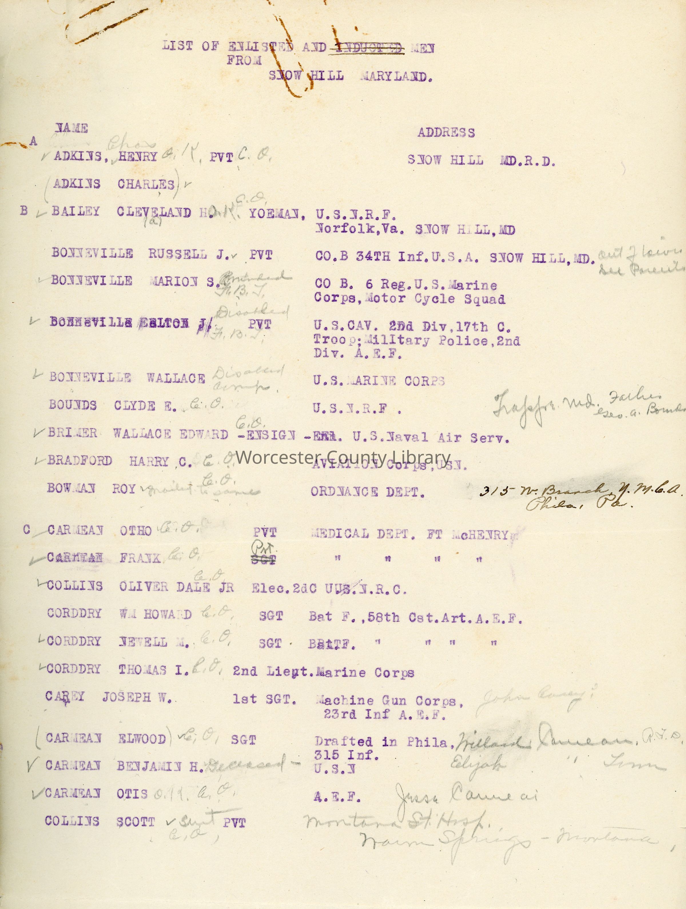 List of Enlisted Men from Snow Hill, Maryland, World War IEntry/Object ID