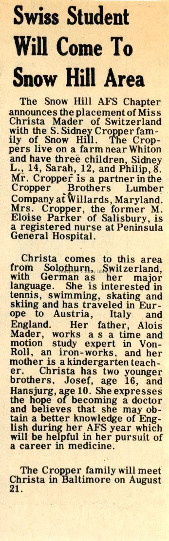 Mabel Eloise Parker Cropper, Philip Lewis Cropper, Sarah Ellen Cropper Gordy, Sewell Sidney Cropper, Sidney Laurence Cropper, Alois Mader, Christa Mader, Hansjurg Mader, Josef Mader, Mrs. Alois Mader, Snow Hill High School, American Field Service, Cropper Brothers Lumber Company, Peninsula Medical CenterCreated By