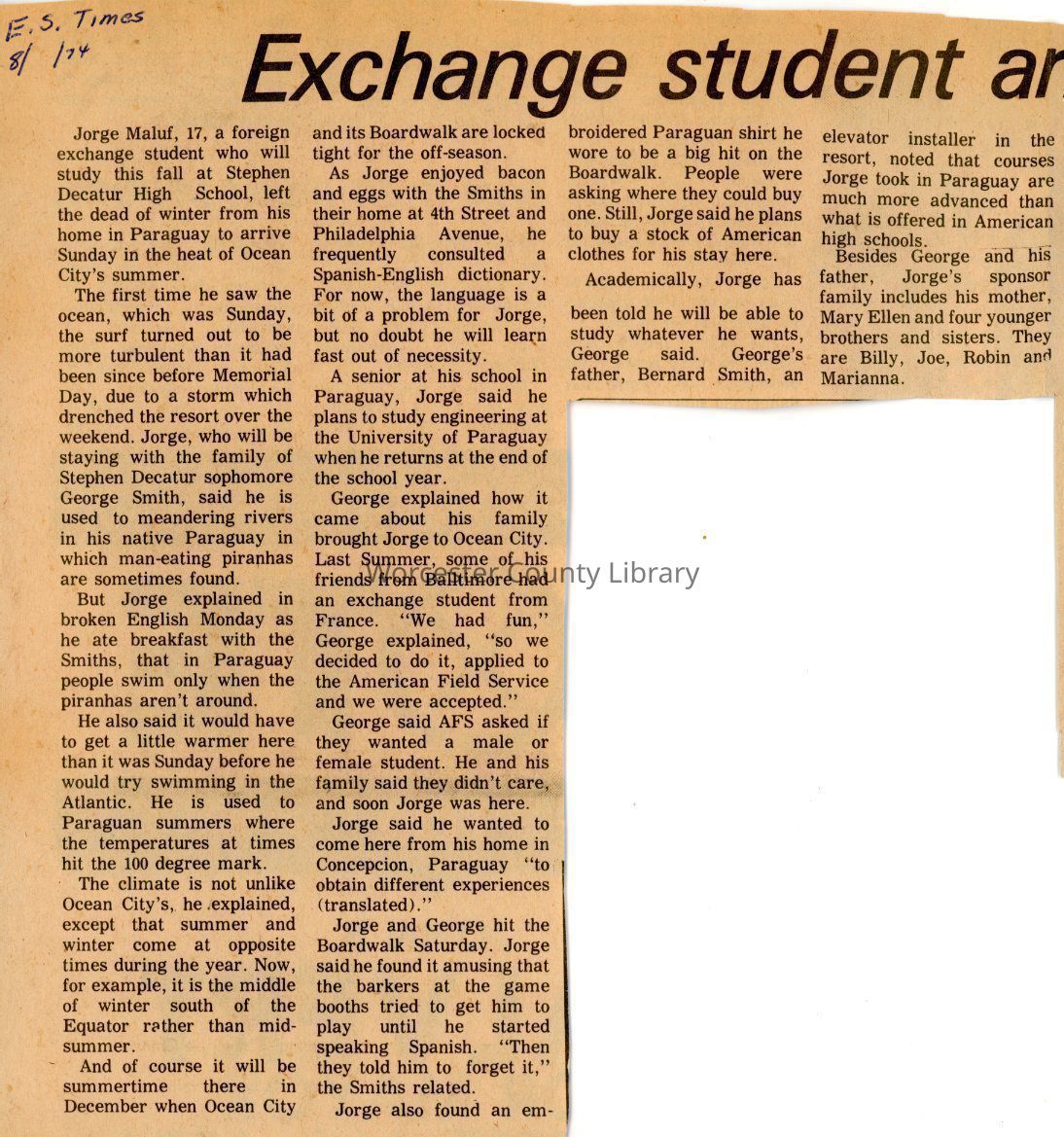 Newspaper clipping, “Exchange student arrives from Paraguay” (Jorge Maluf), Aug. 1974Entry/Object ID