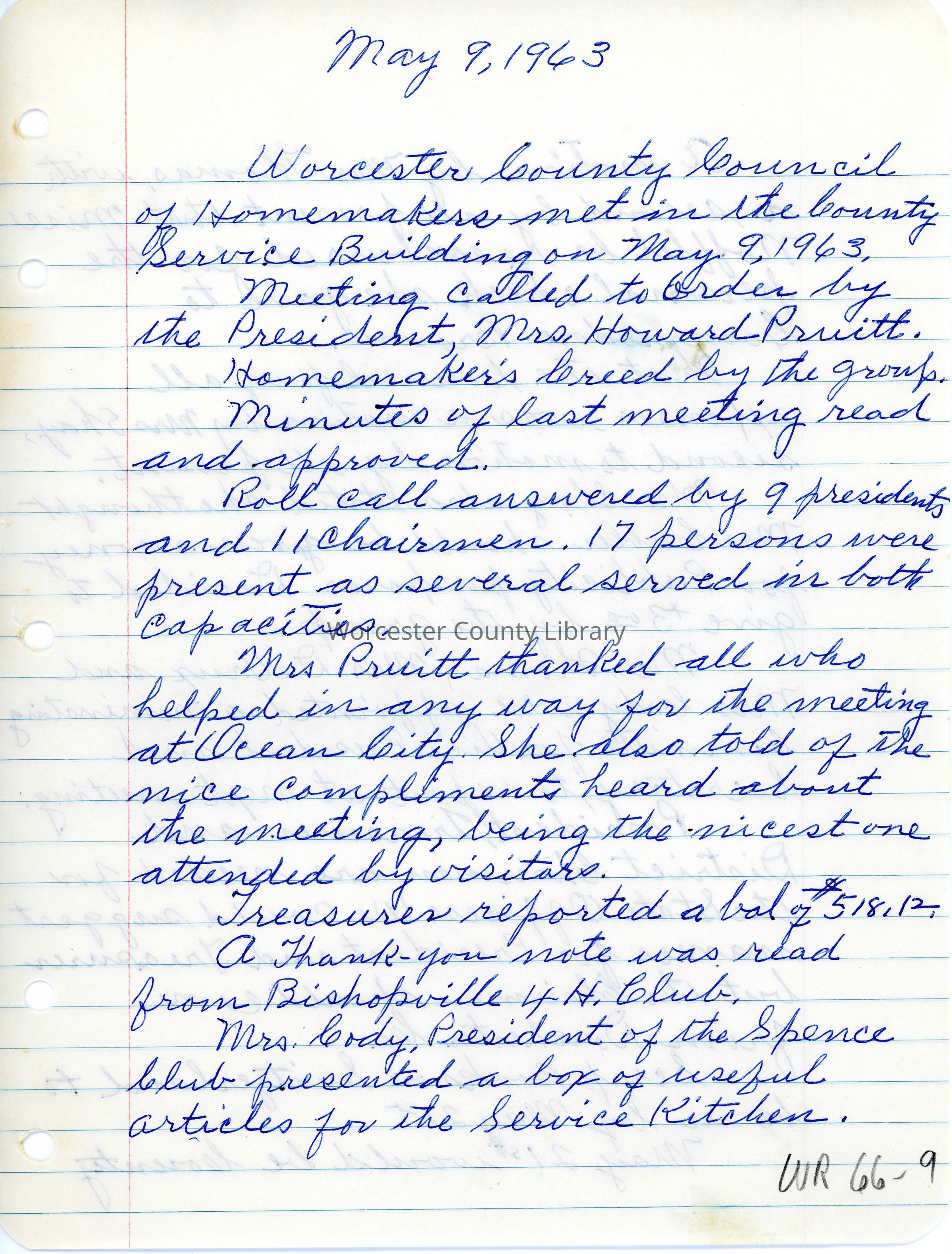 Worcester County Council of Homemakers met in the County Service Building on May 9, 1963.