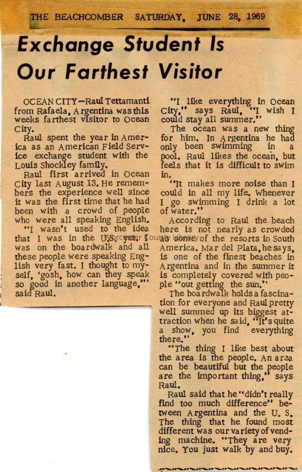 Newspaper clipping, “Exchange Student is Our Farthest Visitor” (Raul Tettamanti) June 28, 1969Entry/Object ID