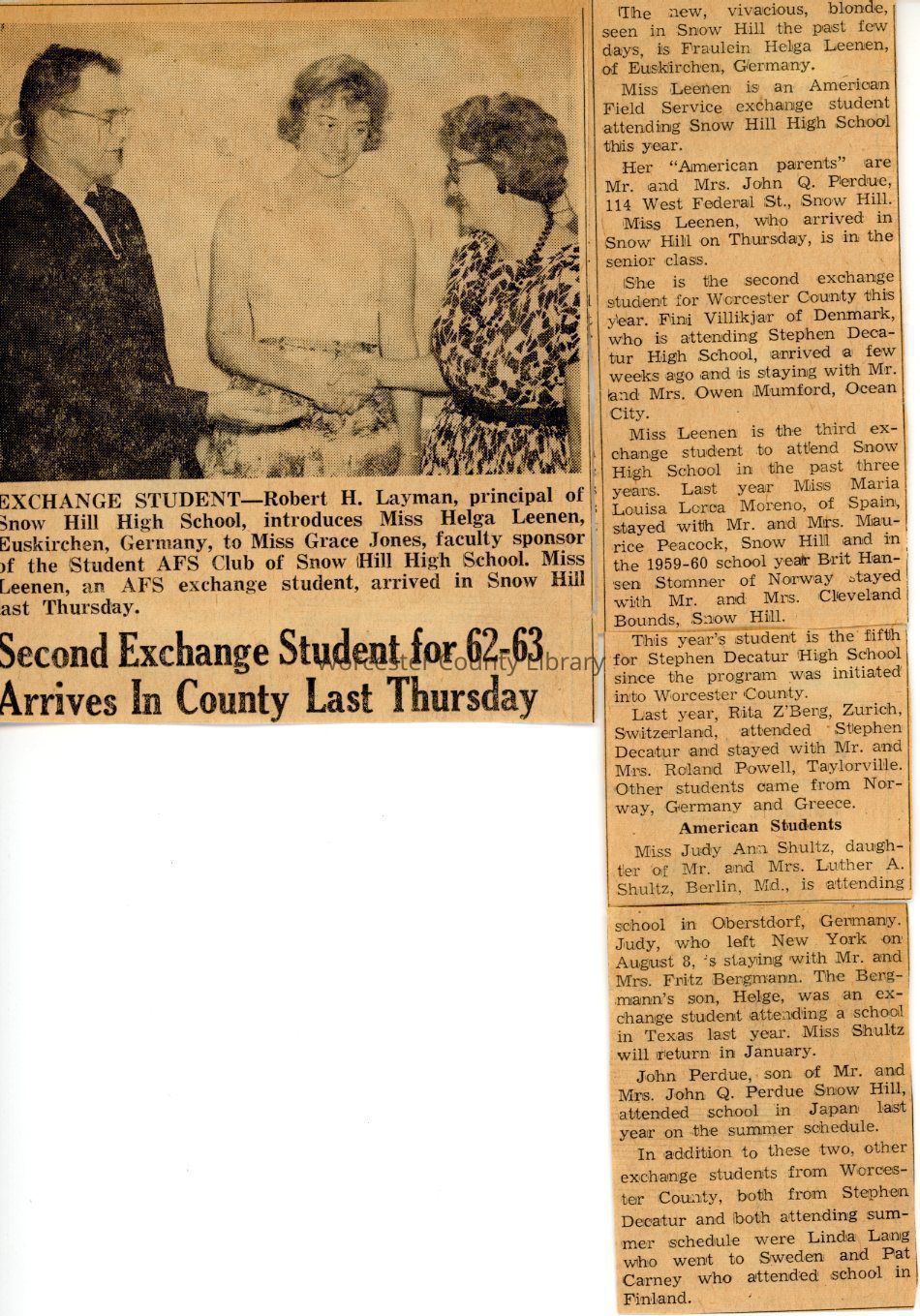 Robert H. Layman, Helga Maria Leenen, Grace Jones, Snow Hill High School, American Field Service, Edith Chandler Perdue, John Quinton Perdue, Sr., Fini Villikjar, Owen Mumford, Mrs. Owen Mumford, Maria Louisa Lorca-Merino, Margaret Harkrader Peacock, Maurice Luther Peacock, Sr., Britt Magna Hansen-Stomner Bohnsdalen, Rodney Cleveland Bounds, Jr., Stephen Decatur High School, Rita Z'Berg, Roland Powell, Mrs. Roland Powell, Judy Ann Shultz Burns, Luther A. Shultz, Ellen M. Weber Shultz, Fritz Bergmann, Mrs. Fritz Bergmann, Helge Bergmann, John Quinton Perdue, Jr., Linda Lang, Pat Carney, Pauline Ellen Cropper Bounds