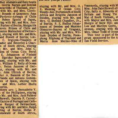 Hugo A. Andretich, Samiha Sayed Ashmawi, James Bailey, Mrs. James Bailey, Kurt Bailey, Bertur A. Bannink, Christian P. W. Bay, Reed Bennett, Mrs. Reed Bennett, Somlak Boonyaritdhi, Rodney Cleveland Bounds, Jr., Pauline Ellen Cropper Bounds, Ralph Robert Bunting, Sr., Betty Parsons Bunting, John R. Busby, Oscar Sheldon Chandler, Jr., Helen Hoevenair Chandler Hannaway, Beverley A. Charteris, Milly Corporaal, Oscar Dias Correa, Jr., Gelso M. Brandao De Alemeida, William Dryden, Mrs. William Dryden, Sally A. Edwards, Nubuo Eguchi, Marianne Fuchsberger, Adriana Gallegos-Vidal, Daniela P. Carvalhal Garcie, Marilyn "Meg" Goetz, Antonio Gomez-Lopez, Daphne Goslar, Stefan P. Groenewald, Joseph George Harrison, Beatrice Wyatt Harrison, Sigridur Ingvarsdottir, Linette C. Irigoyen-Tinajero, Poonphong Ittiphong, Reina Janssen, Brigitta Jansson, Beryl M. E. Johansson, P. E. Staffan Johnannsson, Marie-Christine Y. Kalb, Gloria Karam, Eleanor Pearson Kelly, William E. Kelly, Catherine Kurger, Pamela "Pam" Lee, I. Bernadette V. Lim, Frank Love, Mrs. Frank Love, Pamela A. MacDiarmid, Hoang Thi Ngoc Mai, Veronica Malzacher, O. E. Manning, Mrs. O. E. Manning, Joanne Dickerson Mason, Ralph L. Mason, Jr., Maria Jose Merino-Nino, Dan Moore, Jr., Mrs. Dan Moore, Jr., Maximo Oleaurre-Suarez, Jack Palmer, Mrs. Jack Palmer, Joseph Parker, Mrs. Joseph Parker, Juan E. Pavlovic-Arteaga, Edward Phillips, Mrs. Edward Phillips, Nancy Powell, Roland Powell, Margarita Vlahovic Prinea, John C. Quillen, Mrs. John C. Quillen, Somgiat Sangsurane, John Dale Showell, Mrs. John Dale Showell, Luther A. Shultz, Ellen M. Weber Shultz, Elenita S. Sinaguinan, Frances Bishop Scarborough Sturgis, James Thomas Sturgis, Sr., Omar Todd, Mrs. Omar Todd, John Ullrich, Mrs. John Ullrich, Alcira Rosa Silvia Villarino, W. G. Williams, Mrs. W. G. Williams, American Field Service