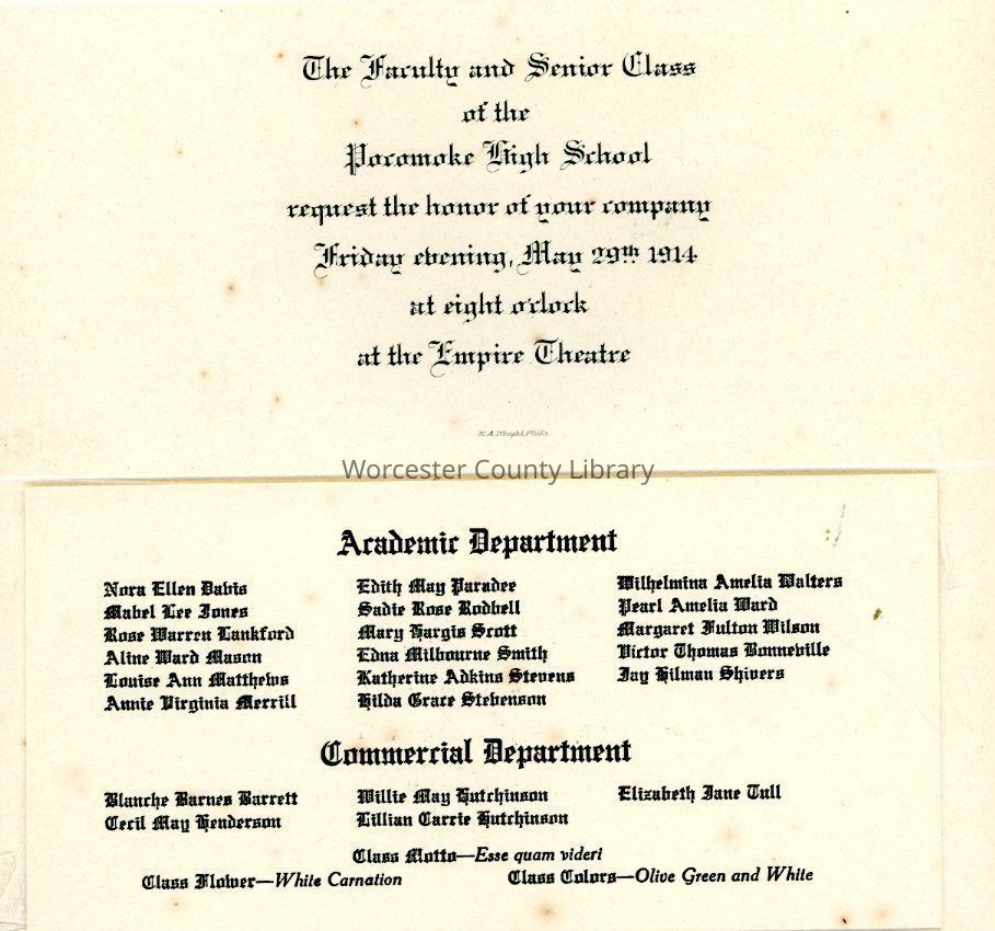 Pocomoke High School, Nora Davis Schmitz, Mabel Lee Jones, Rose Warren Lankford Shivers, Aline Ward Mason, Louise Ann Matthews Gordy, Annie Virginia Merrill, Edith May Paradee Moore, Sadye Rodbell Cohen, Mary Hargis Scott Matthews, Edna Milbourne Smith, Katherine Adkins Stevens Etchison, Hilda Grace Stevenson, Wilhelmina Amelia Waters, Pearl Amelia Ward, Margaret Fulton Wilson, Victor Thomas Bonneville, Jay Hilman Shivers, Blanche Barnes Barrett, Cecil May Henderson Howard, Willie May Hutchinson, Lillian Carrie Hutchinson, Elizabeth Jane Tull