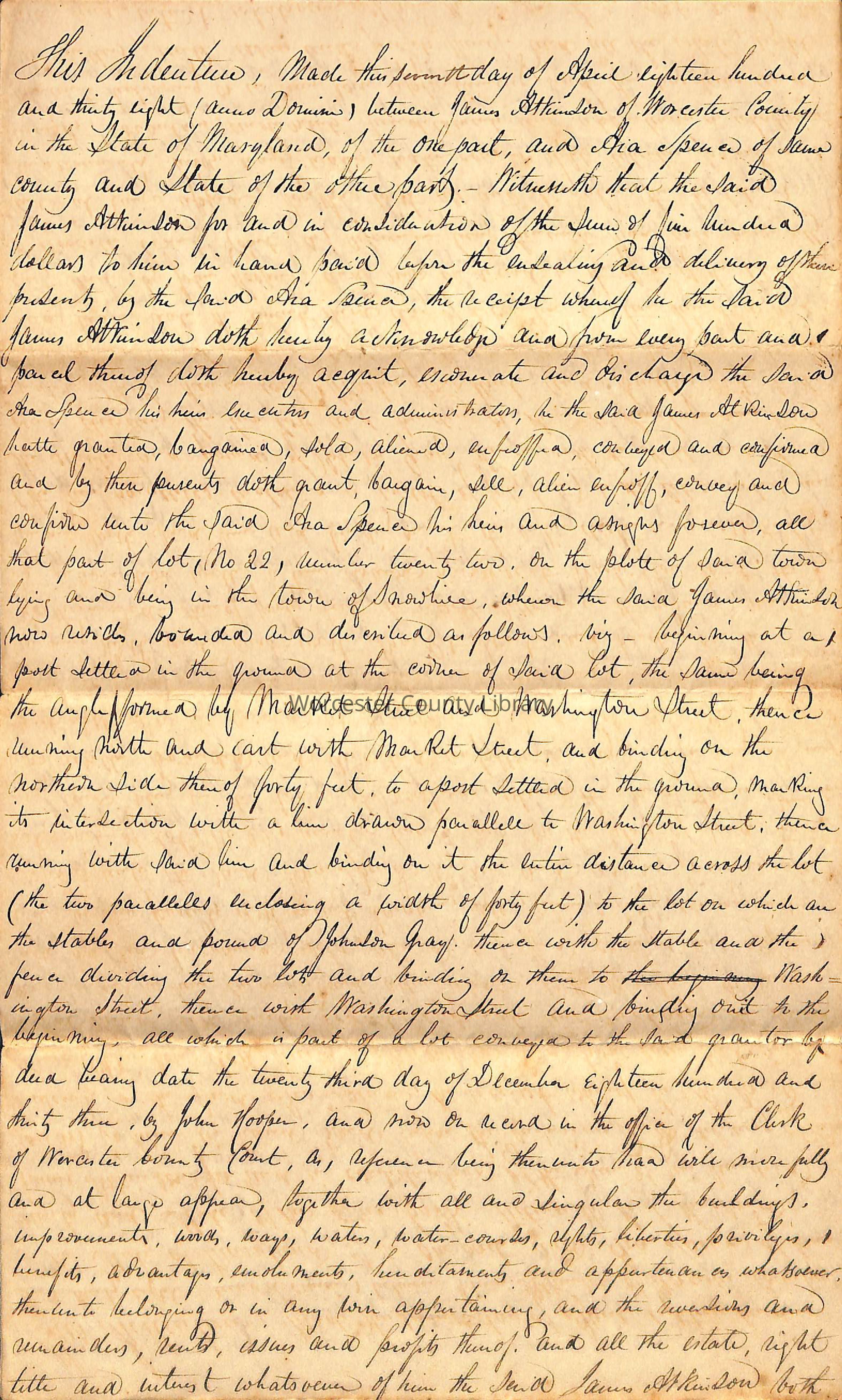 Indenture, James Atkinson and Ara Spence, 1838Entry/Object ID