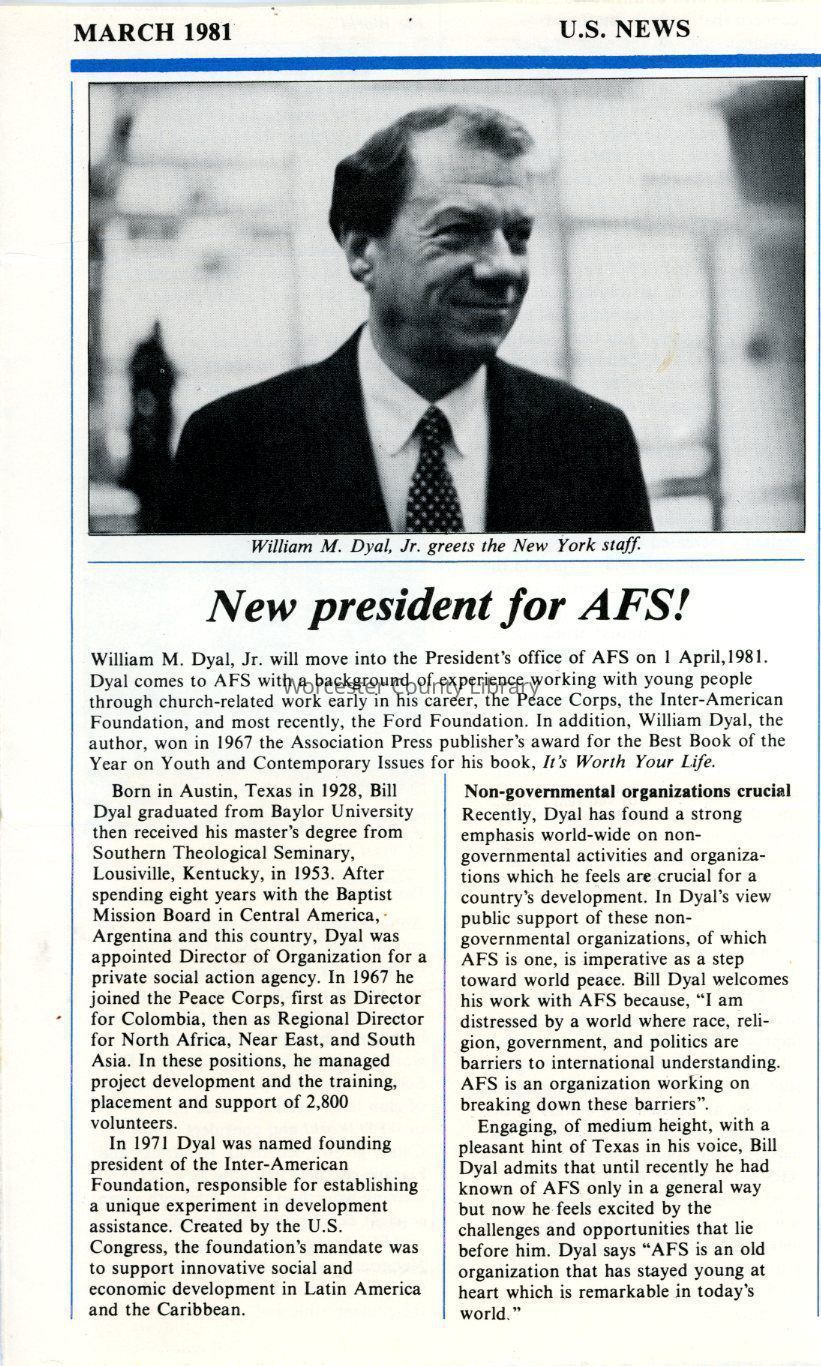 Newsletter clipping, “New president for AFS!,” Mar 1981Entry/Object ID
