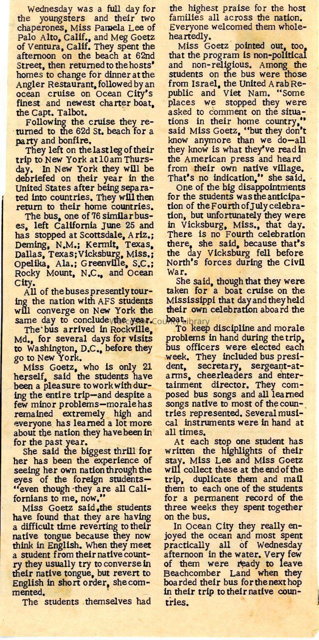 Miss Goetz pointed out, too, that the program is non-political and non-religious. Among the students on the bus were those from Israel, the United Arab Republic and Viet Nam. "Some places we stopped they were asked to comment on the situations in their home country,' said Miss Goetz, "but they don't know anymore than we do- all they know is what they've read in the American press and heard from their own native village. That's no indication," she said.