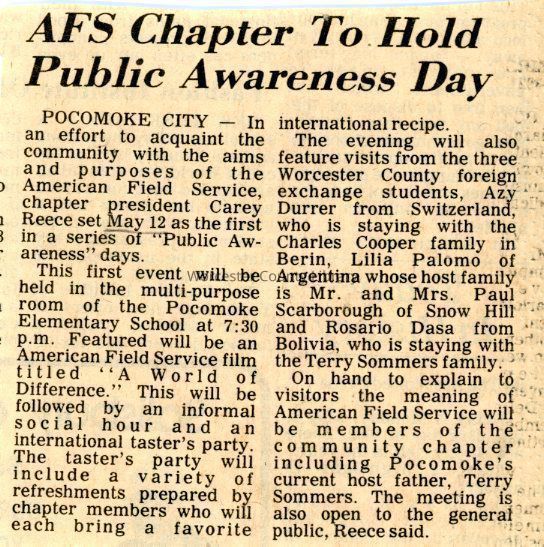 Newspaper clipping, “AFS Chapter to Hold Public Awareness Day,” May 3, 1982Entry/Object ID