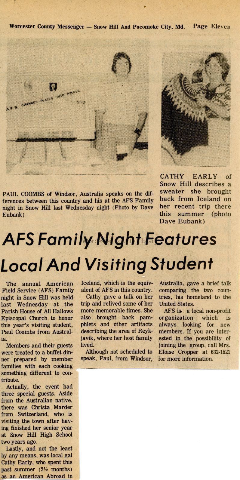 Newspaper clipping, “AFS Family Night Features Local and Visiting Student” (Paul Coombs and Cathy Early), Sep. 1976Entry/Object ID