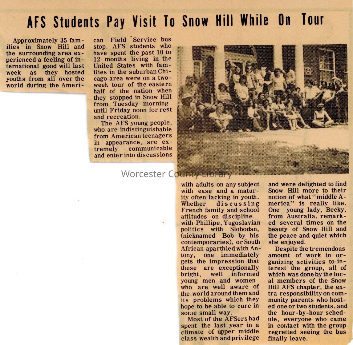 Newspaper clipping, “AFS Students Pay Visit to Snow Hill While on Tour,” July 1974Entry/Object ID